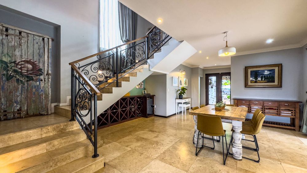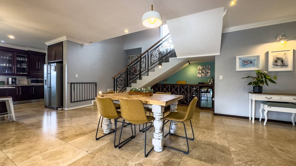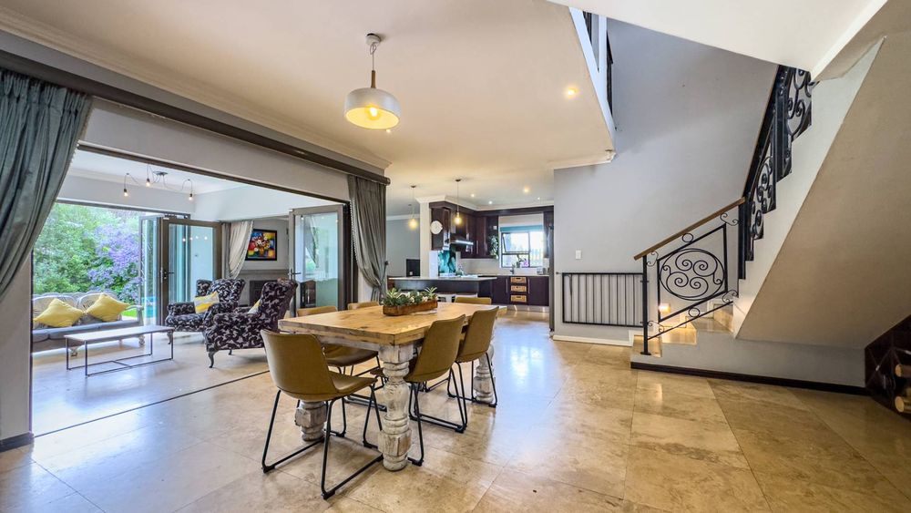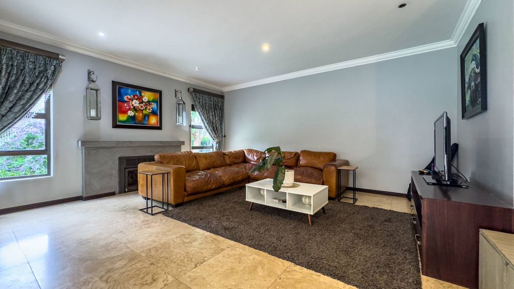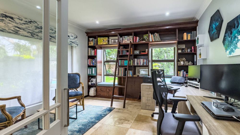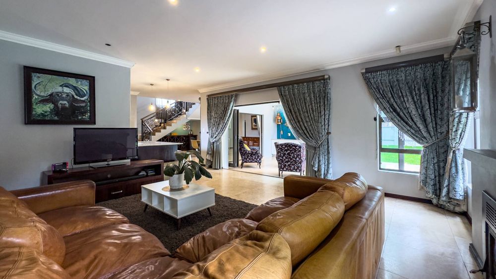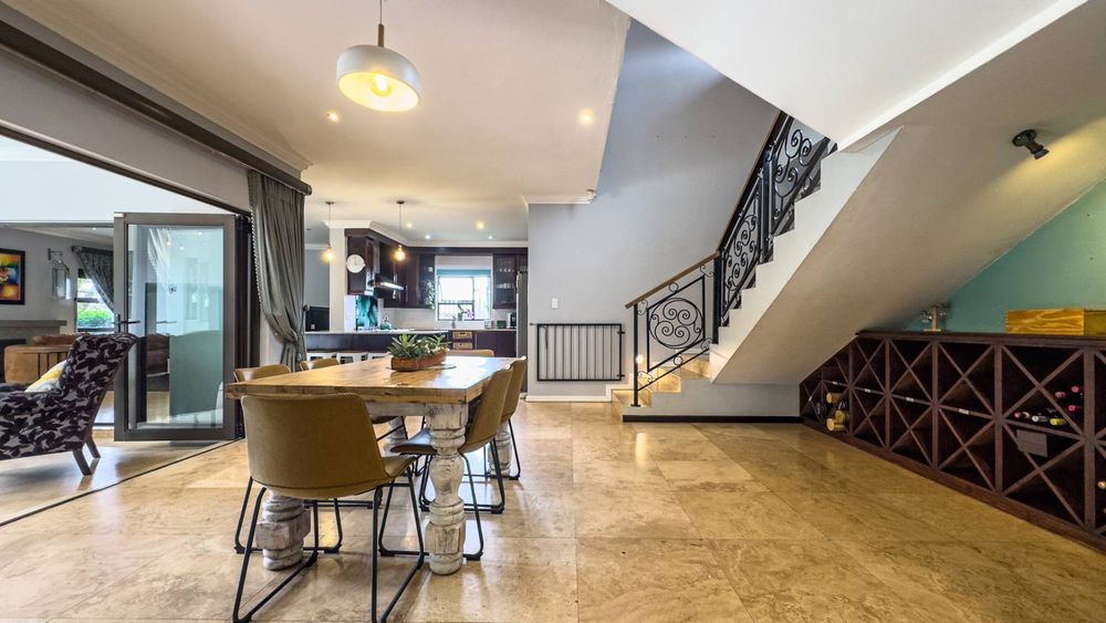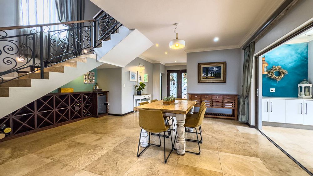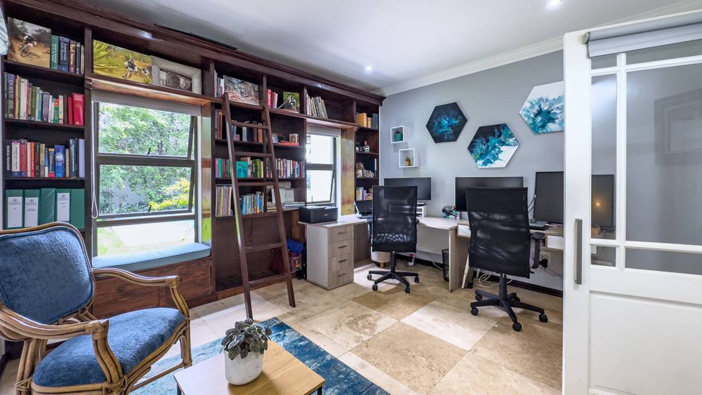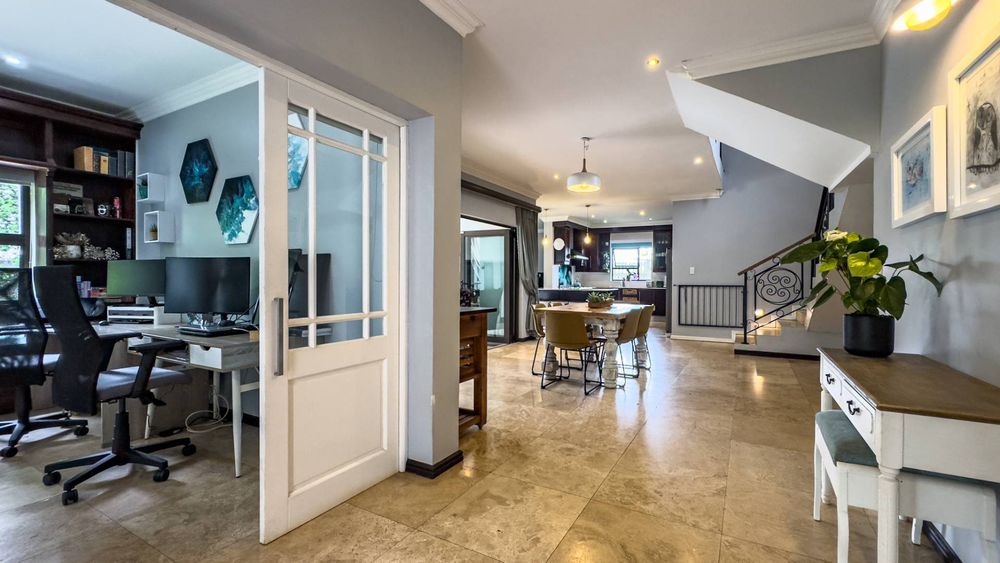 The ground floor also boasts a spacious study with built-in cupboards, offering versatility as it can easily be converted into a fifth bedroom if desired. The inviting lounge area features a cozy fireplace and opens directly onto the indoor patio, complete with a built-in braai—perfect for hosting gatherings with friends and family.