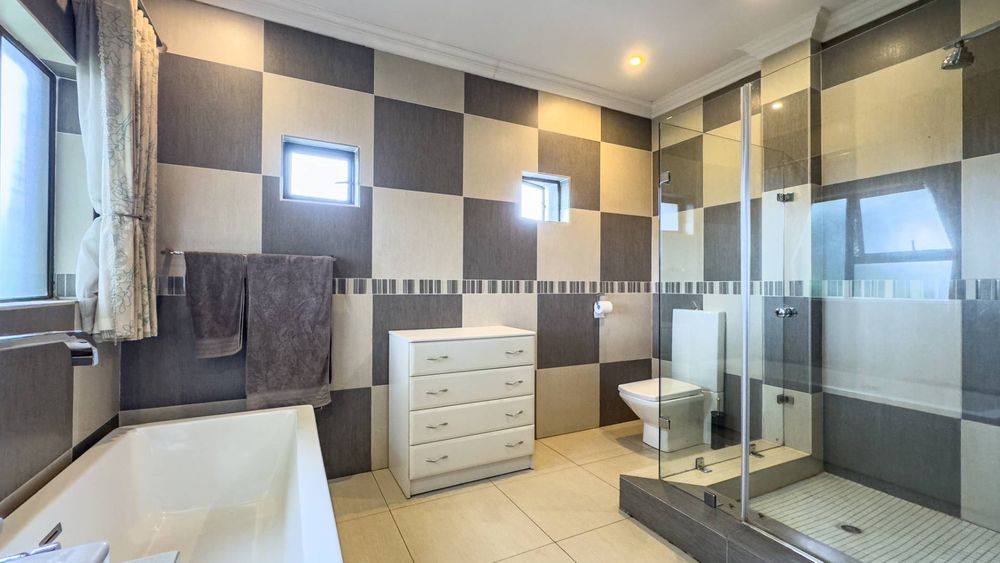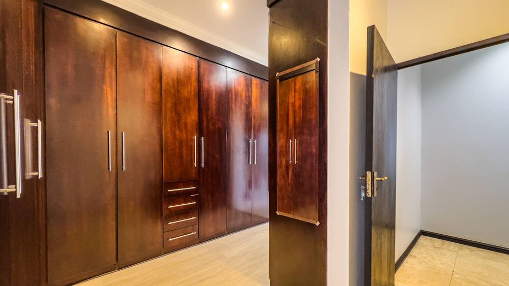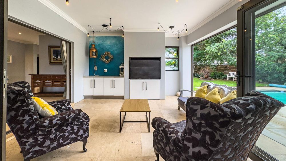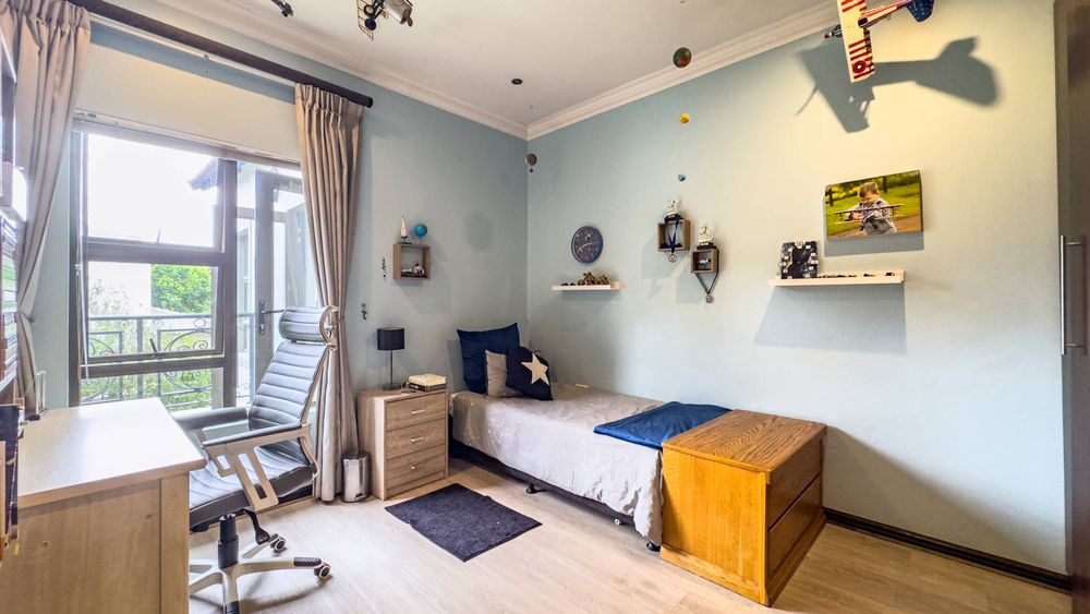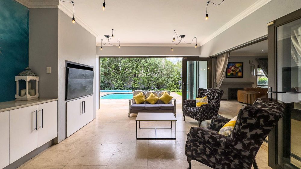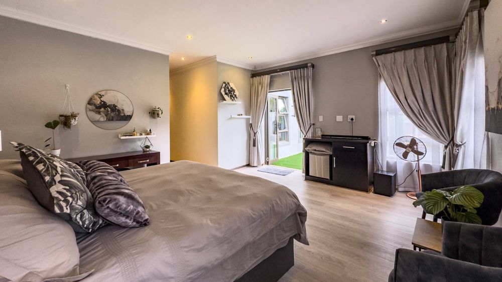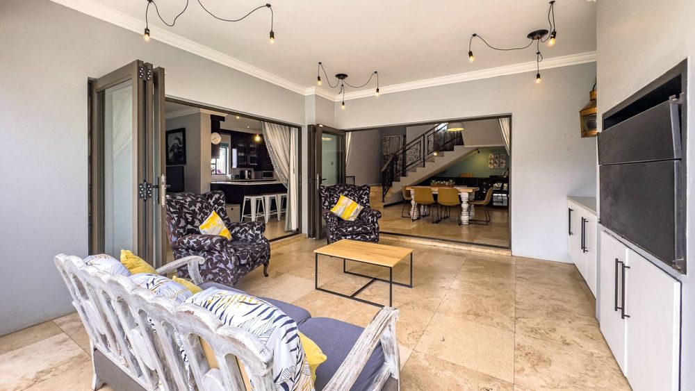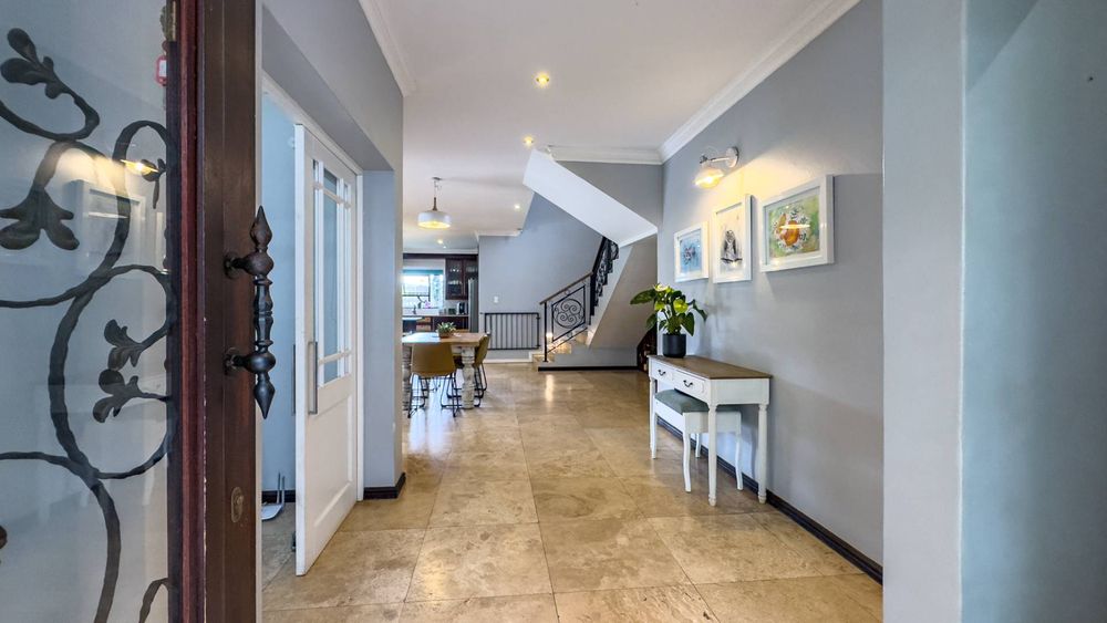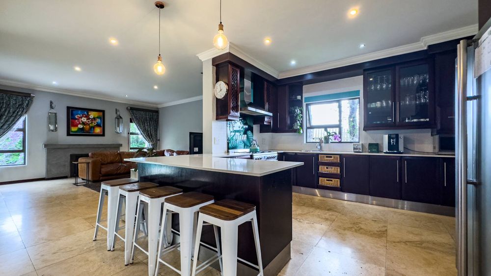 The ground floor also boasts a spacious study with built-in cupboards, offering versatility as it can easily be converted into a fifth bedroom if desired. The inviting lounge area features a cozy fireplace and opens directly onto the indoor patio, complete with a built-in braai—perfect for hosting gatherings with friends and family.