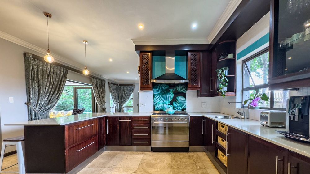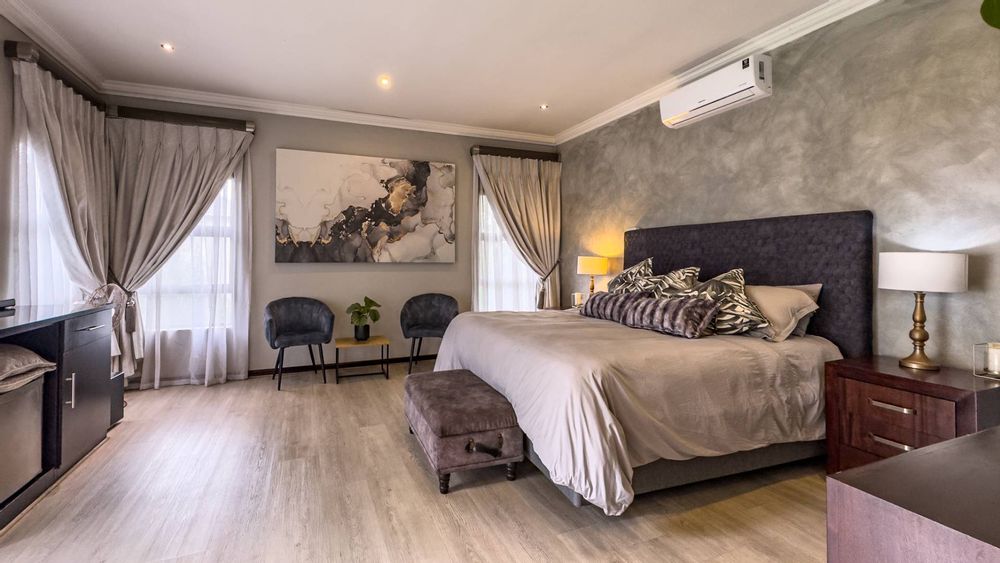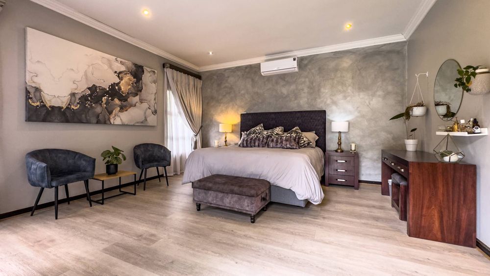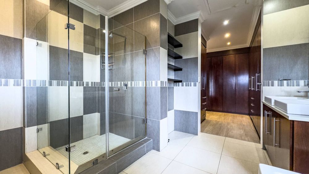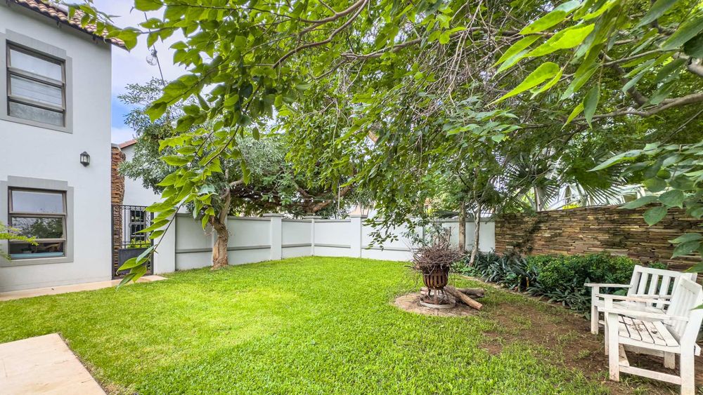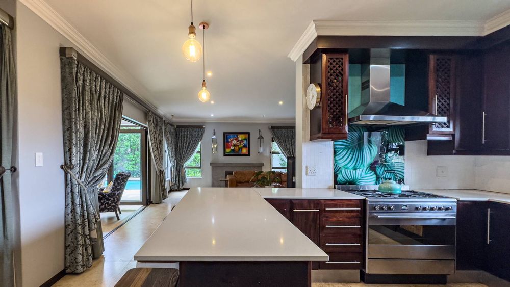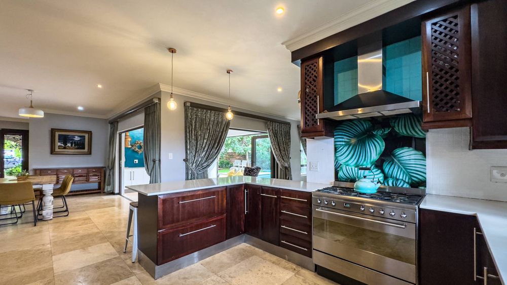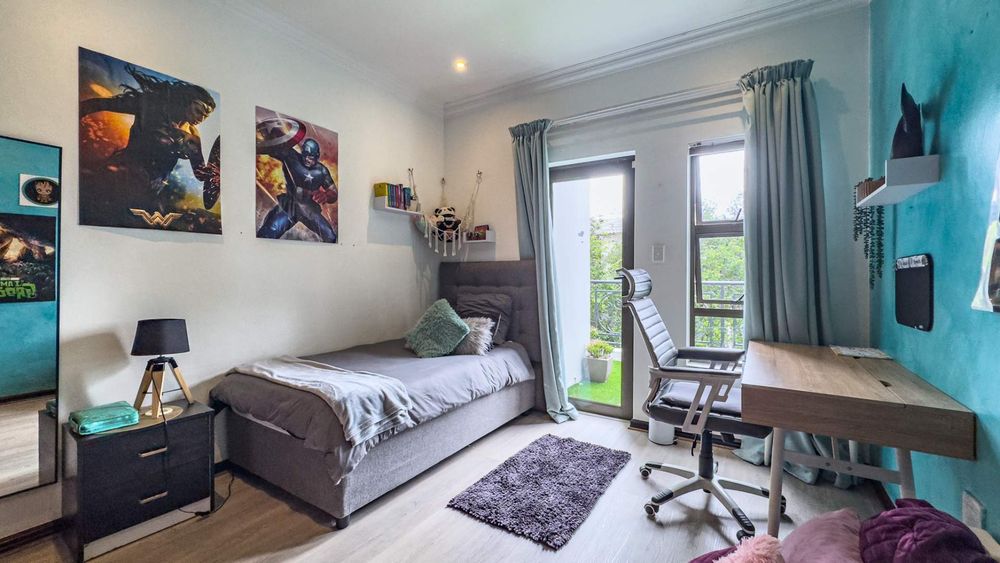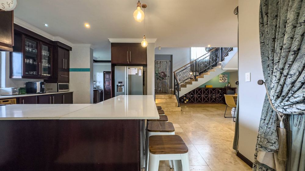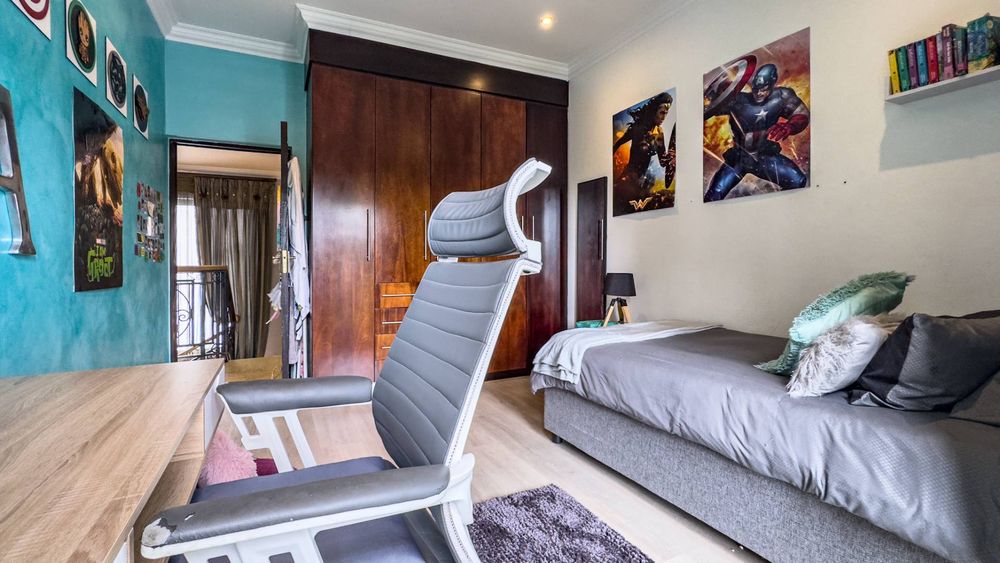 The ground floor also boasts a spacious study with built-in cupboards, offering versatility as it can easily be converted into a fifth bedroom if desired. The inviting lounge area features a cozy fireplace and opens directly onto the indoor patio, complete with a built-in braai—perfect for hosting gatherings with friends and family.