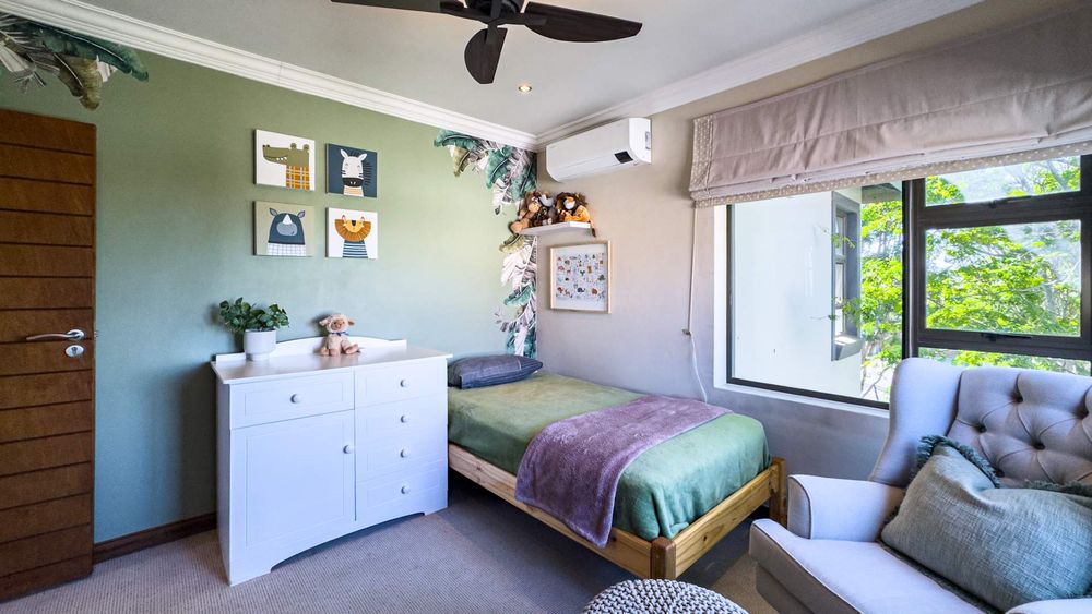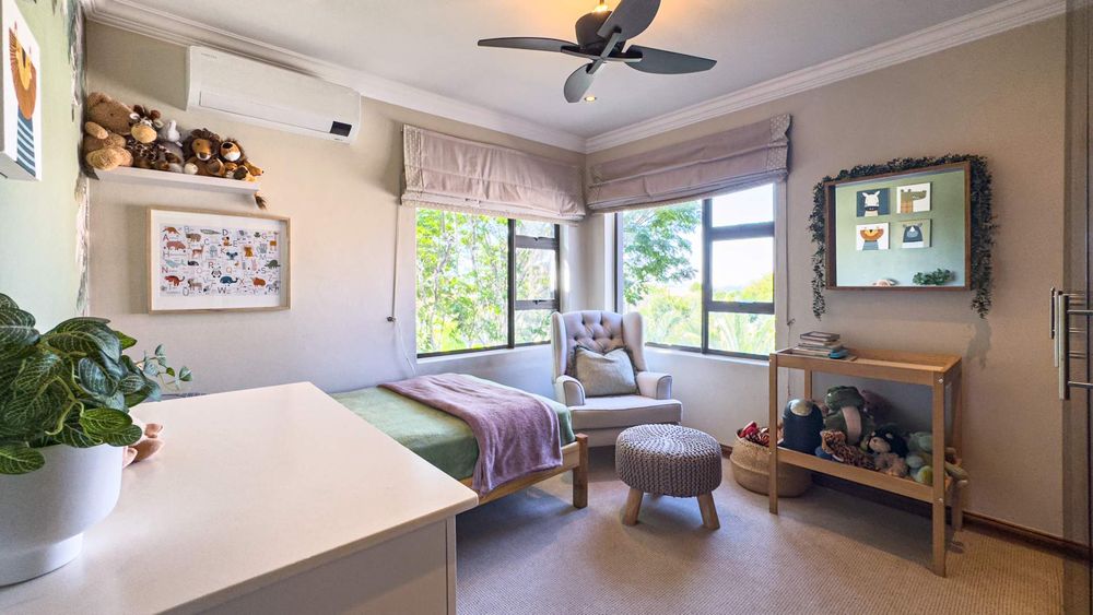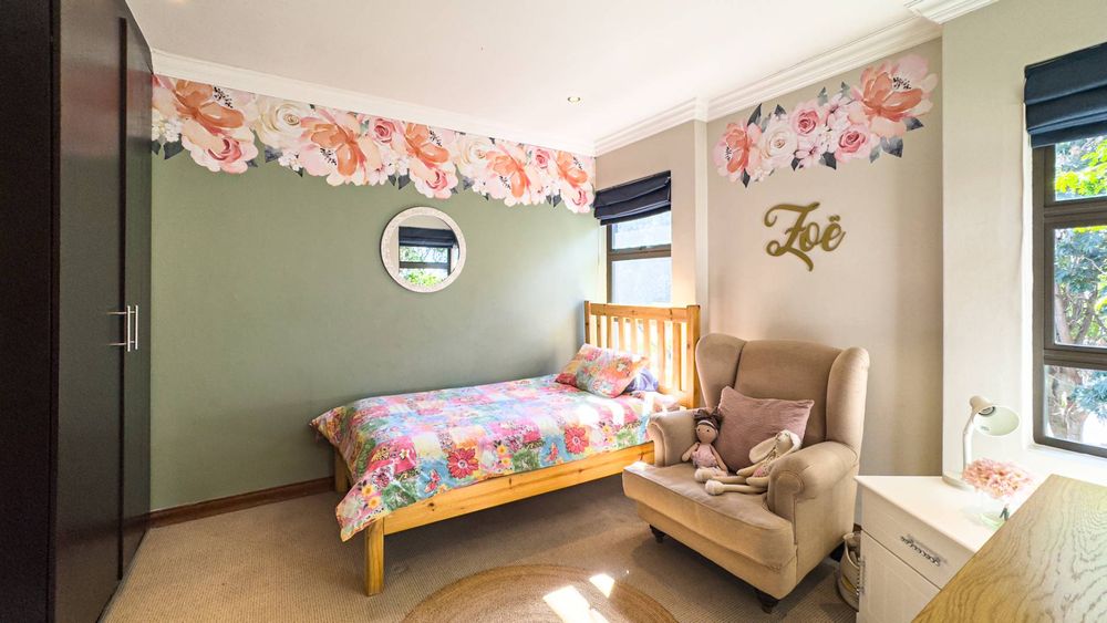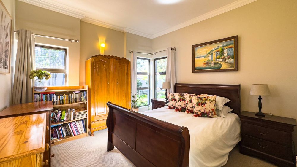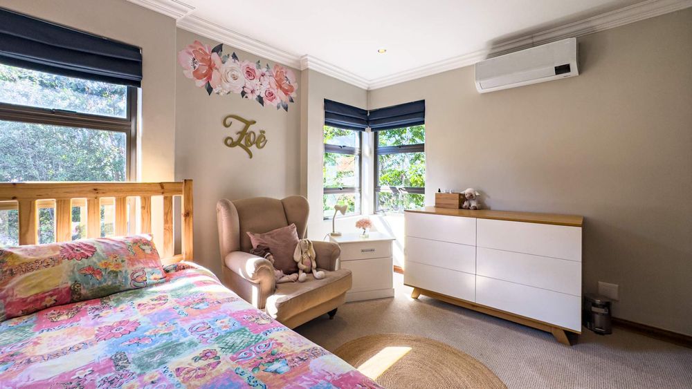 You have two bedrooms (or bedroom and study) downstairs and 3 beautifully sunny and spacious bedrooms upstairs - both children's bedrooms offer corner windows bringing the outdoor feel of trees indoors, 2 Garages and a storeroom set up that can be used as a staff room as it is next to a bathroom offering shower, handbasin & toilet.