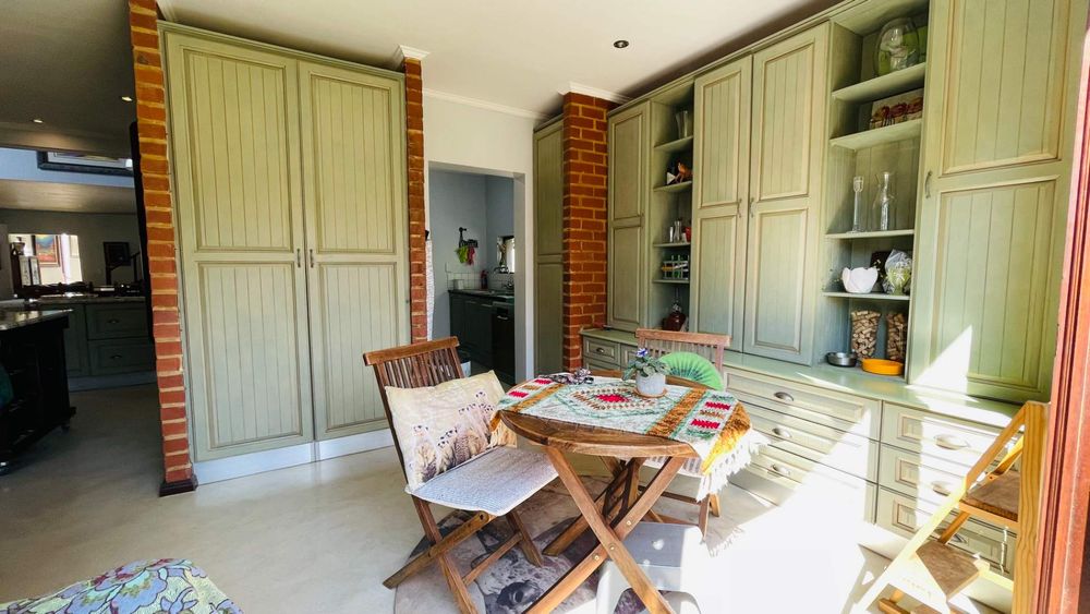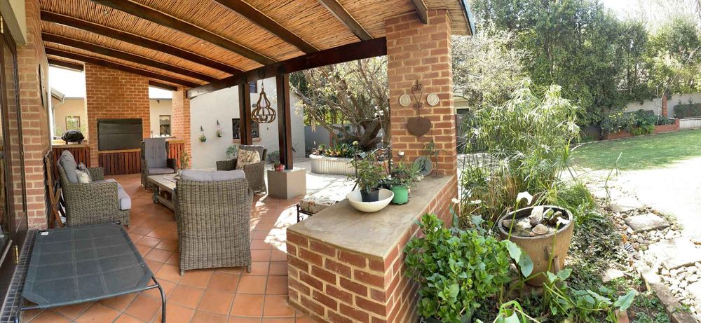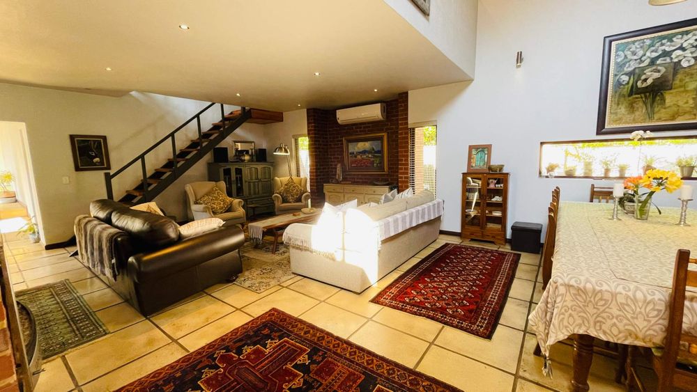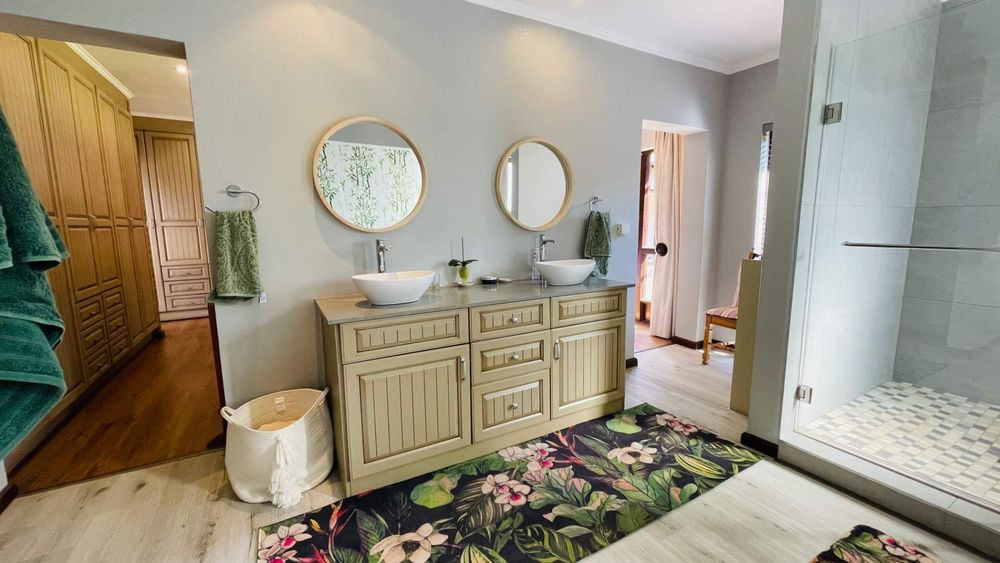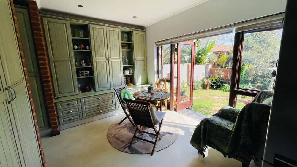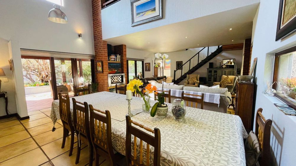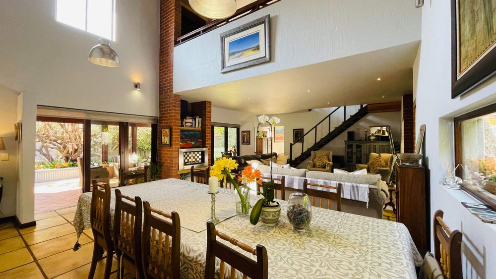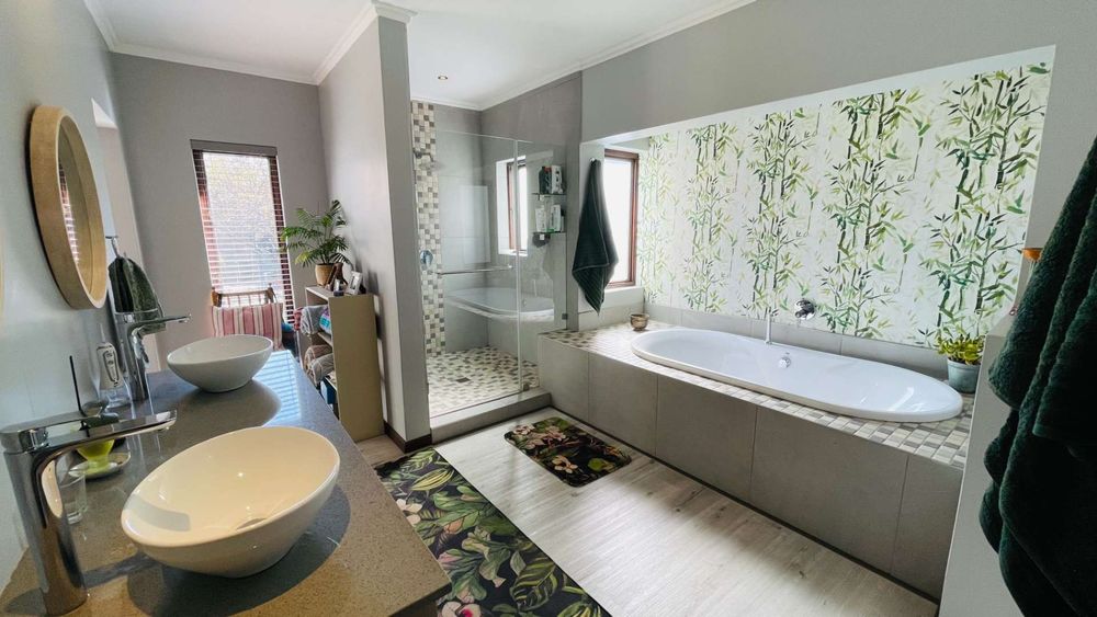 A home with Established Garden, bespoke kitchen with a sunny coffee nook overlooking the pause corner garden. Magnificent double volume dining room living out onto the undercover patio with built in braai. Open plan lounge with built in gas fireplace and upstairs loft TV room or children's playroom. The main bedroom lives out onto the garden offering the most out of spacious airy living with ample cupboard space and a modern en suite bathroom with two basins and frameless shower.