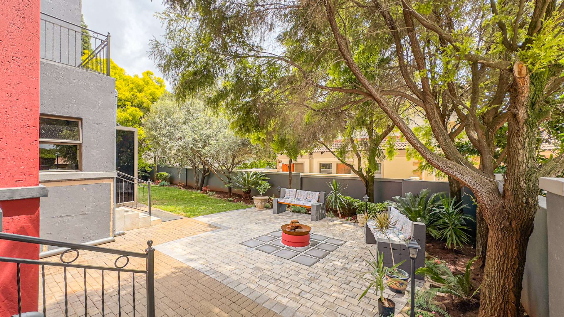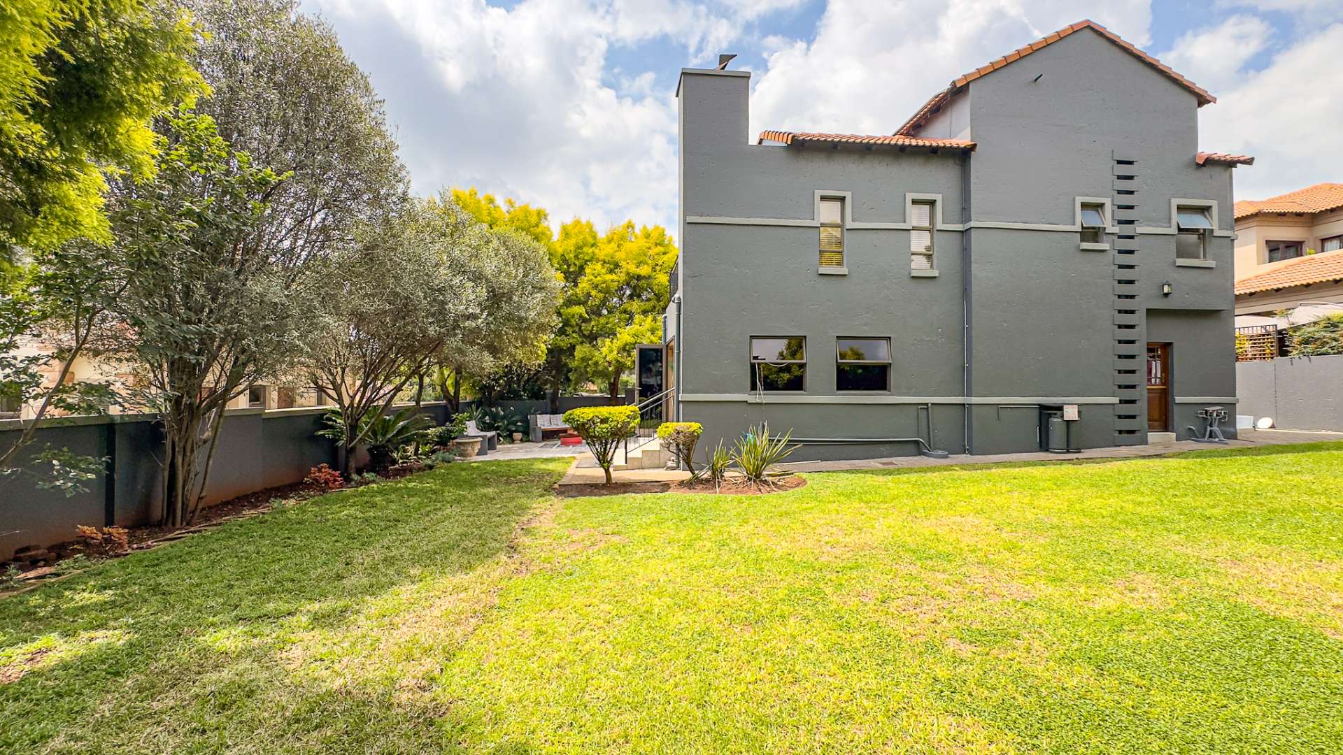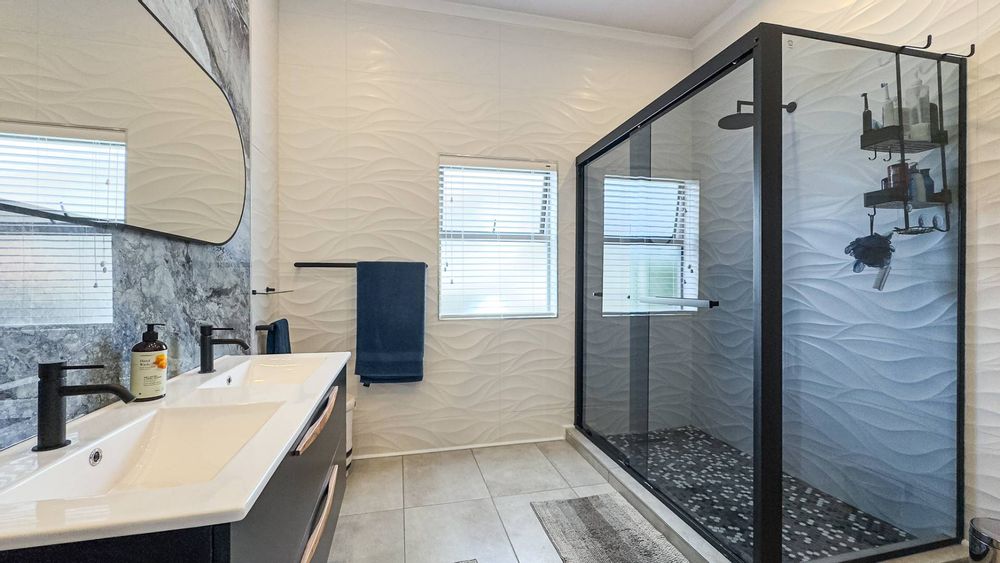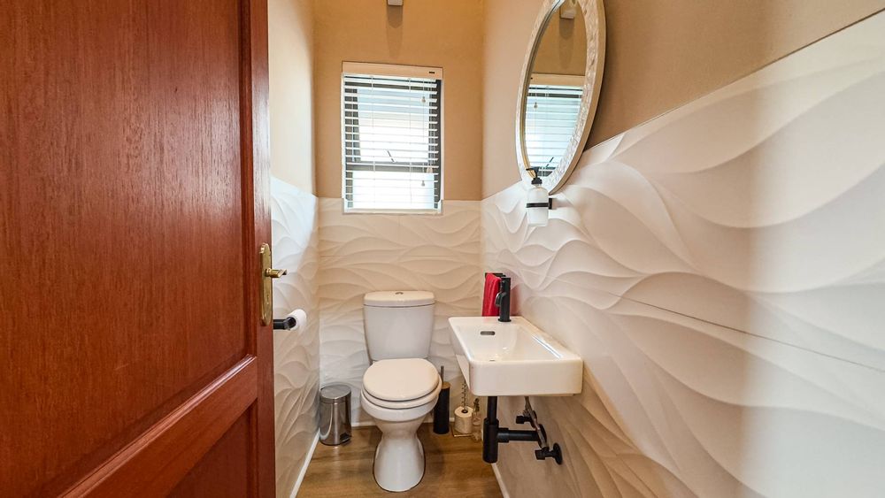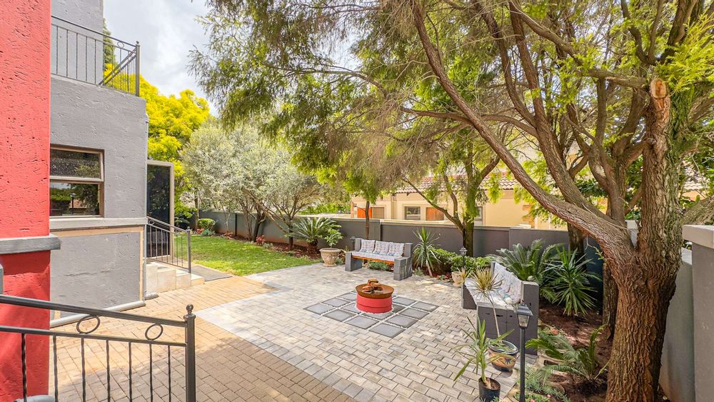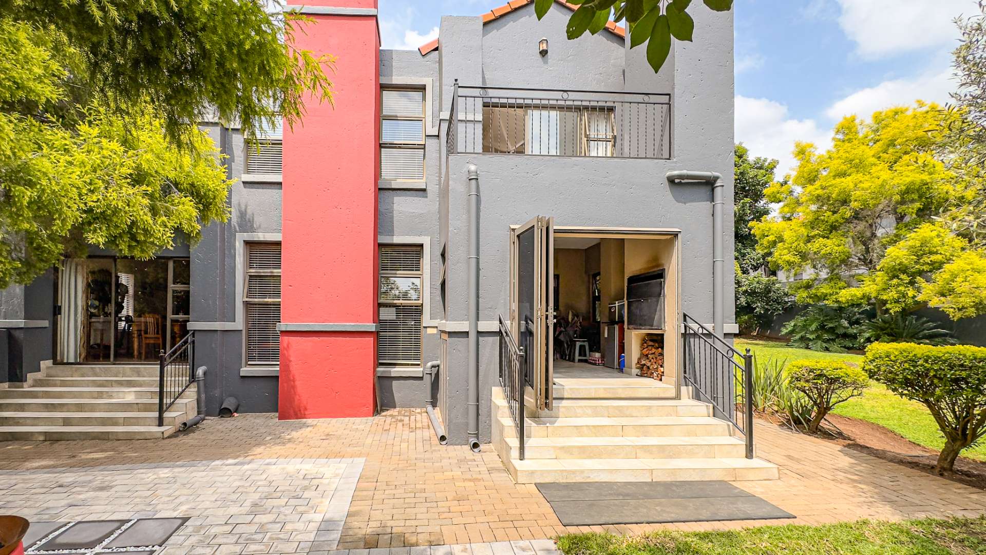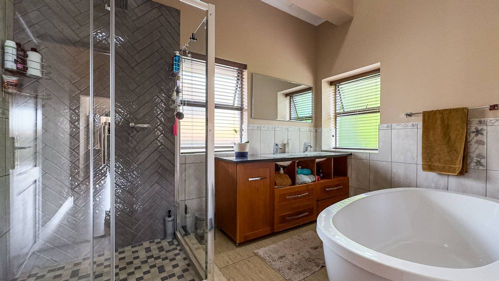 An enclosed and undercover patio with a built-in braai opens to a beautifully landscaped garden. This outdoor area, complete with an open-seated patio, is perfect for hosting gatherings or enjoying quiet moments surrounded by nature.