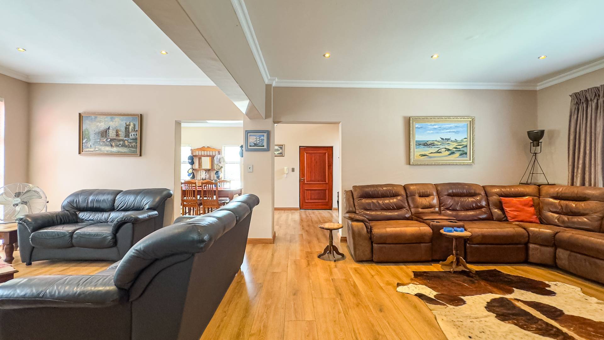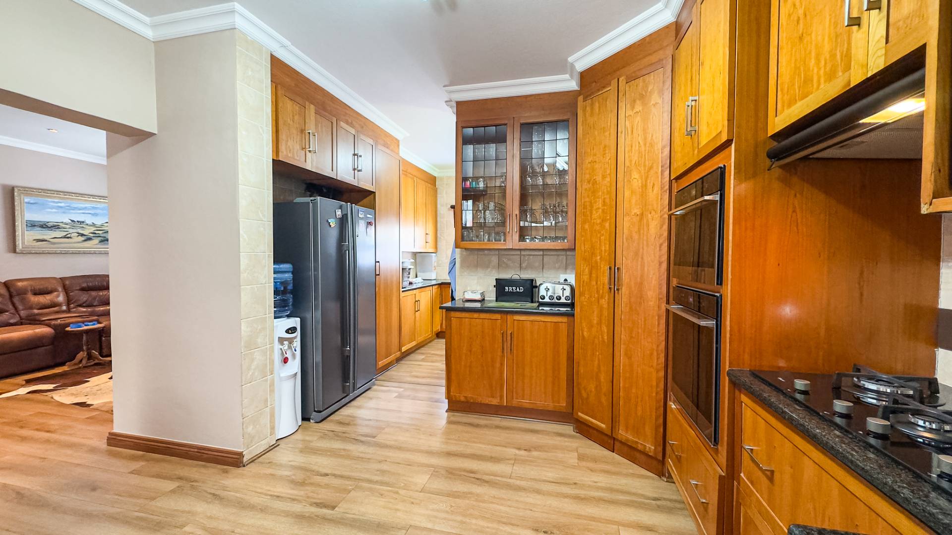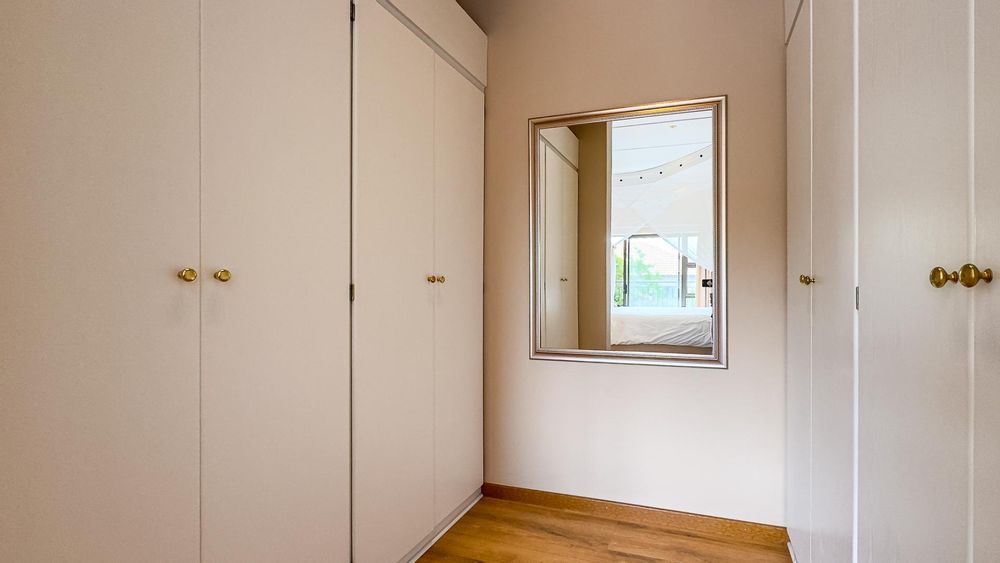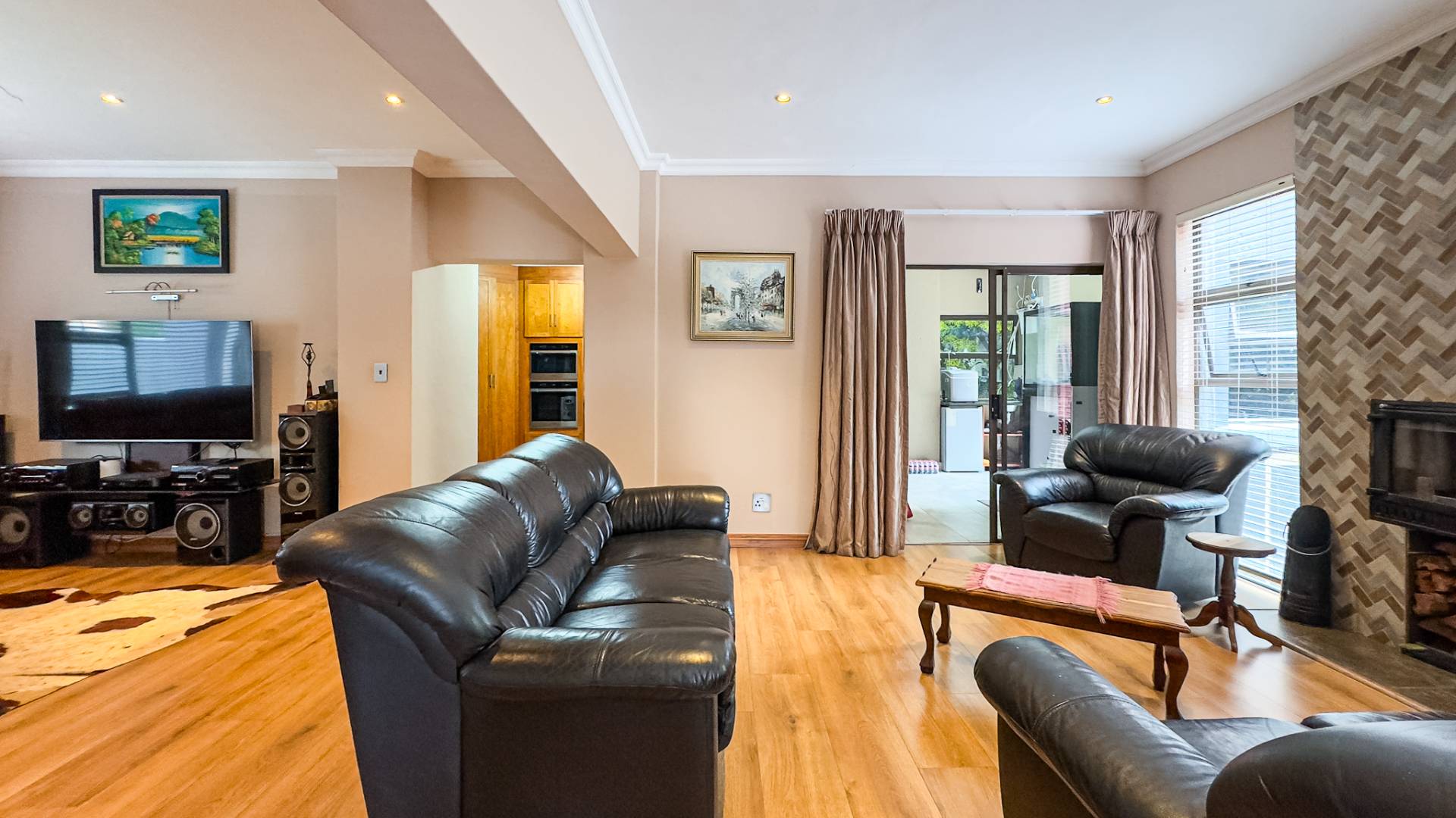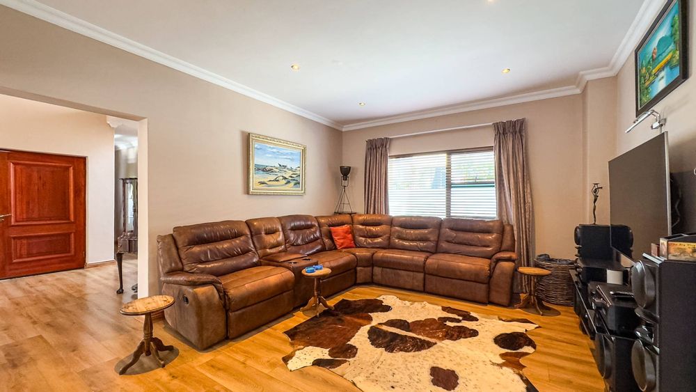 A formal study room offers versatility, easily converting into an additional bedroom if needed. The solid wood kitchen is equipped with ample cupboard space and a separate scullery, with convenient access to the patio for seamless entertaining.