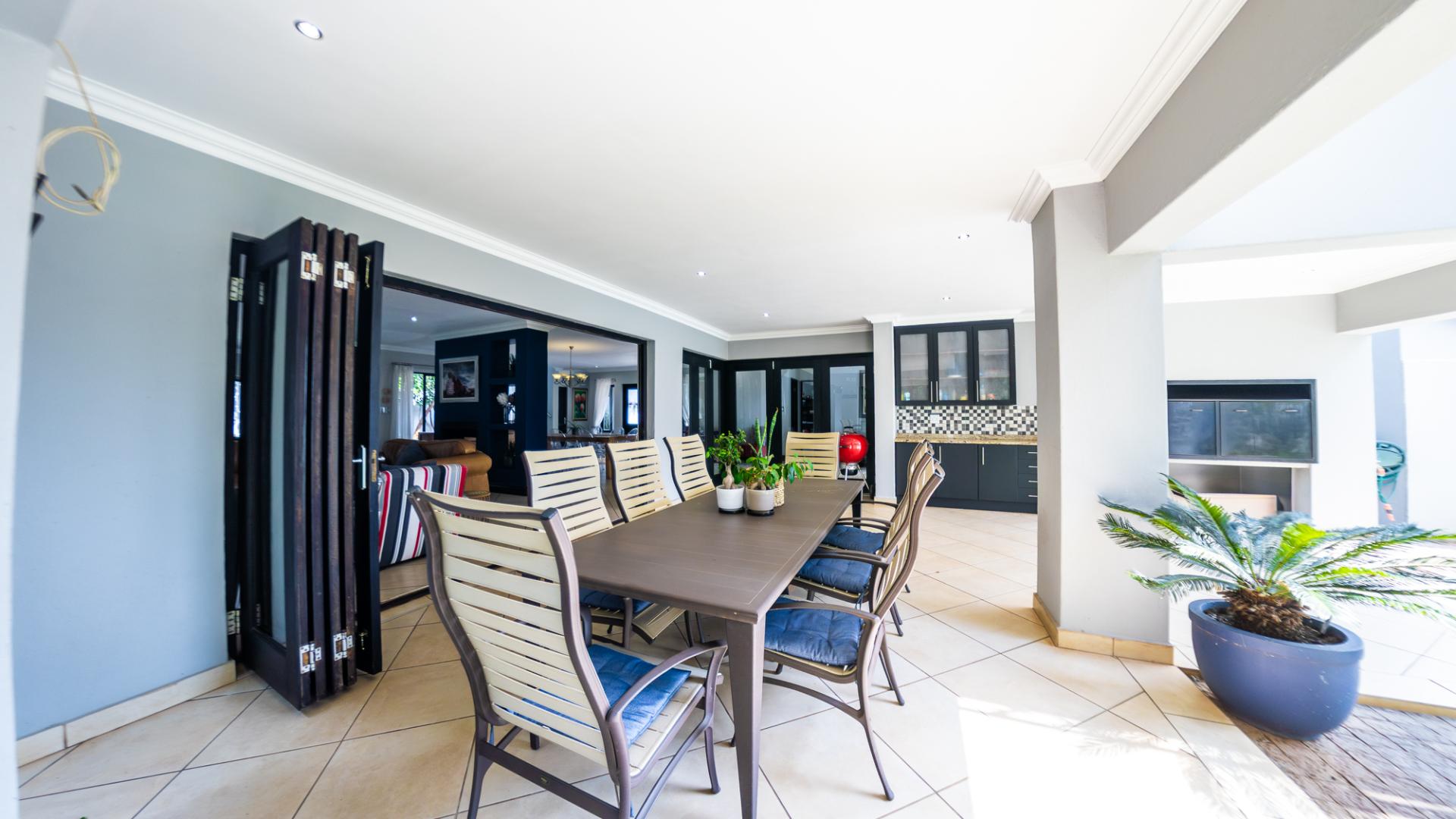 Welcoming foyer and entrance leads you into the large open plan downstairs living area. The property has been designed to offer entertainment on a large scale. For that seamless floorspace integration, Lounge & Dining room are connected by a feature wall with a fireplace . The folding stacking doors open completely inviting the outdoor space indoors and vice versa. In the kitchen you will be spoilt with ample cupboard & counterspace...even a walk in pantry and separate scullery - what is more you have a separate laundry room with enough space for additional laundry features such as ironing.
