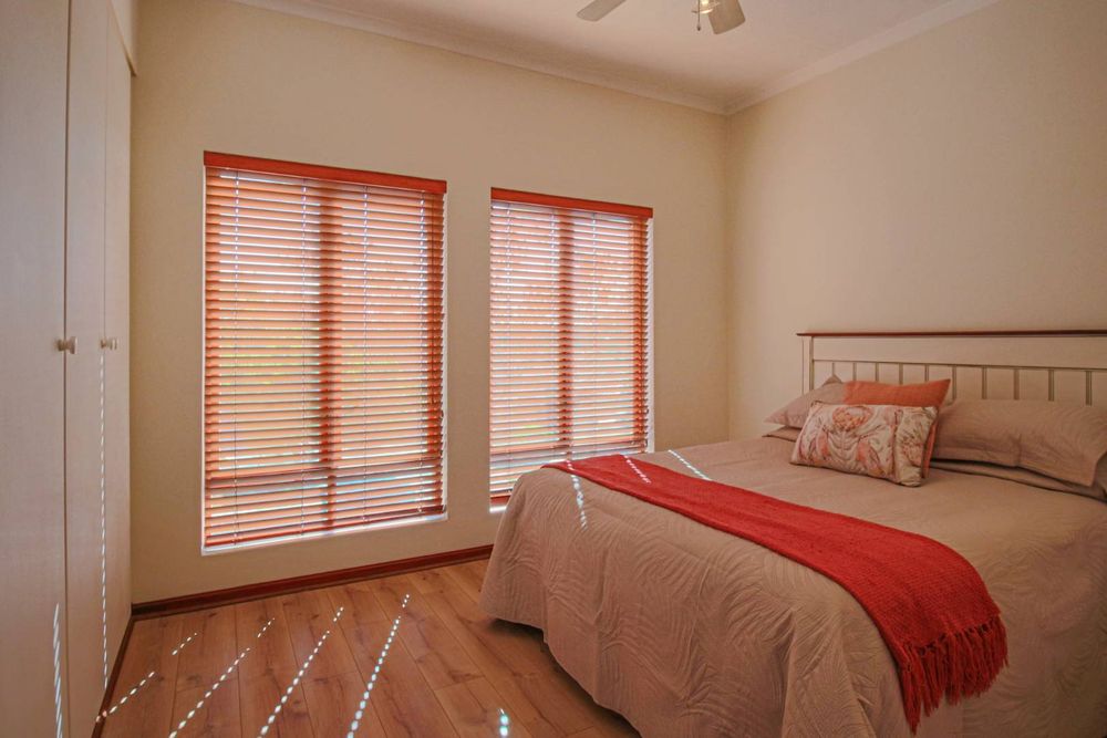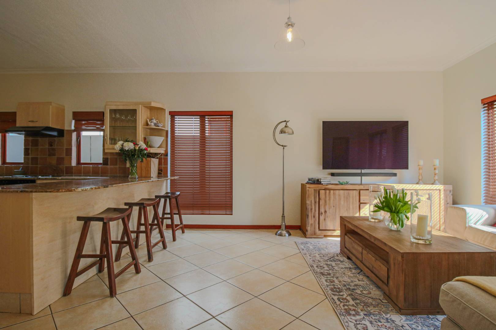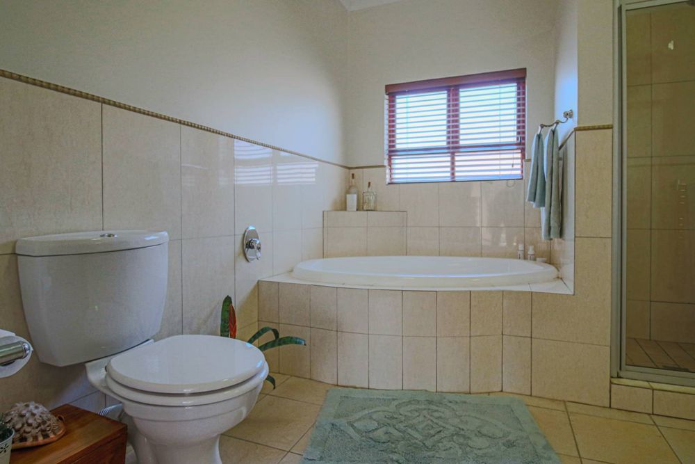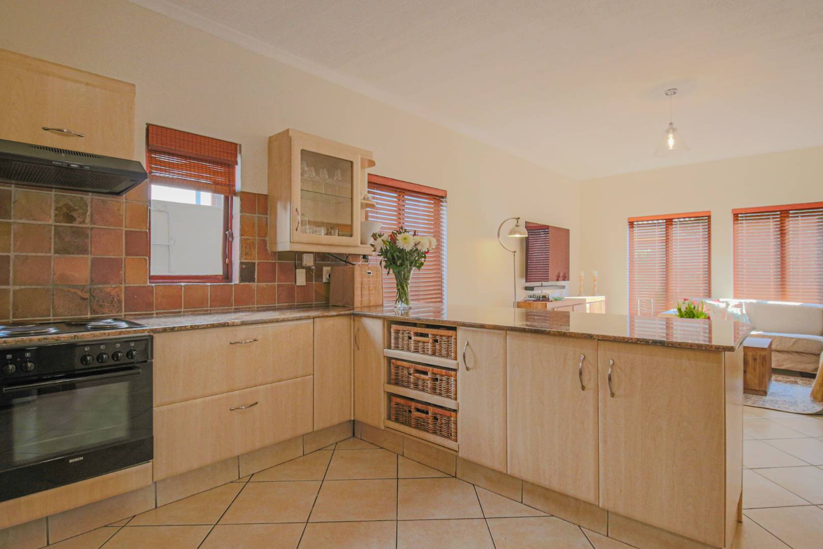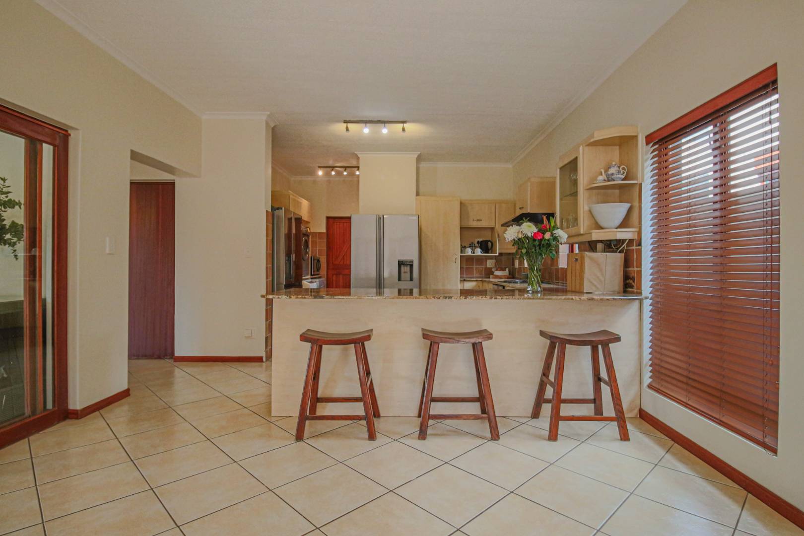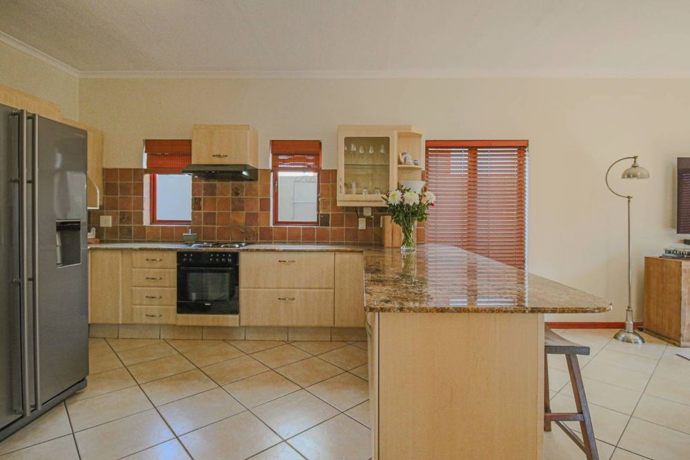 The kitchen is thoughtfully designed for family-style cooking, with a large counter that provides space for seating, double fridge space, and a separate scullery that accommodates all your appliances. This functional layout ensures that meal preparation is both efficient and enjoyable.