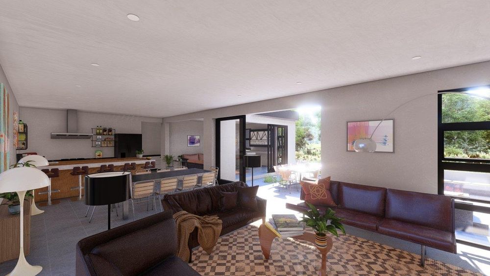 The ground level is where the magic happens. The home opens to a stylish open-plan living and dining area, a modern kitchen with a walk-in pantry, and a separate scullery and laundry. A fully equipped bar and entertainment room with a built-in braai flows effortlessly onto an open patio overlooking the pool, boma, and firepit — perfect for relaxed evenings or weekend get-togethers. A study offers a quiet work-from-home space, while the ensuite guest room ensures comfort for visitors. A triple garage and staff quarters add to the functionality.