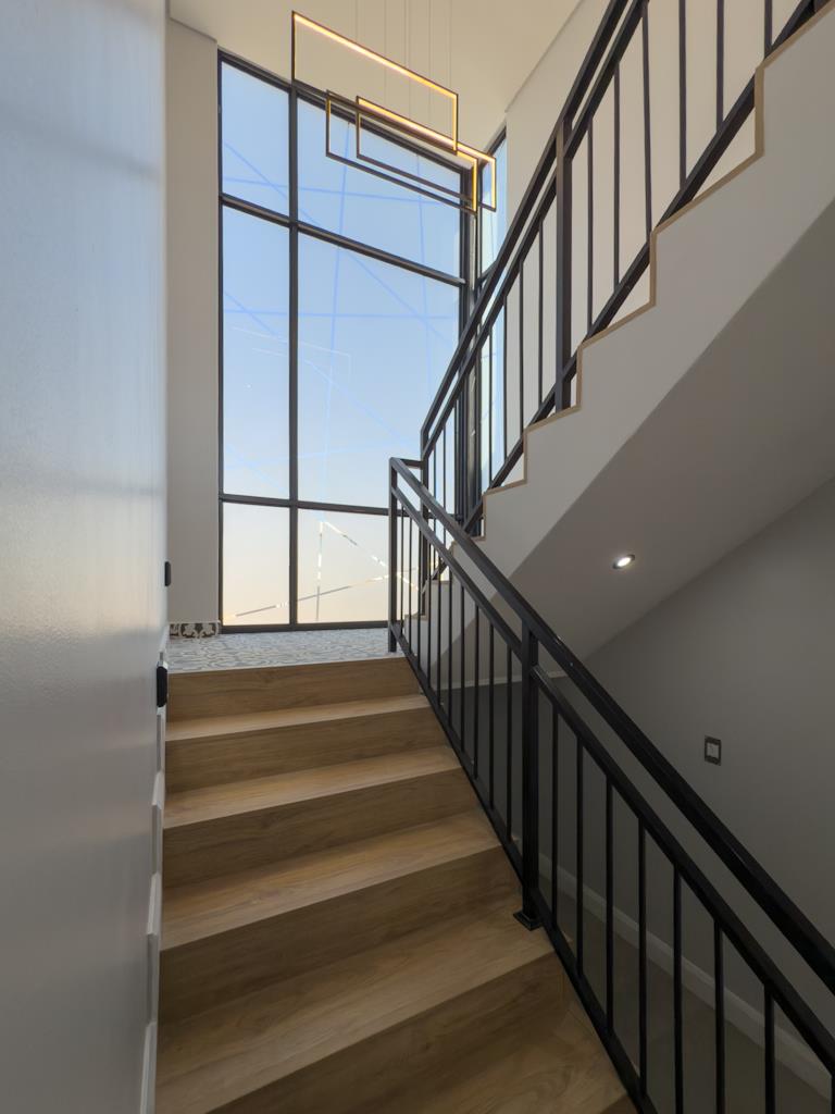 The ground floor welcomes you with expansive open-plan living and dining areas, a modern kitchen with a separate scullery, and a dedicated bar & entertainment room featuring a built-in braai. Enjoy the outdoors with an open deck, boma, firepit, and a sparkling pool — all designed to host unforgettable gatherings.