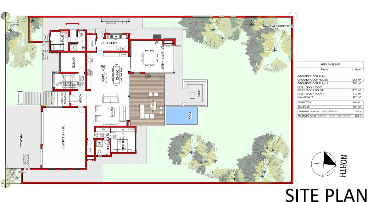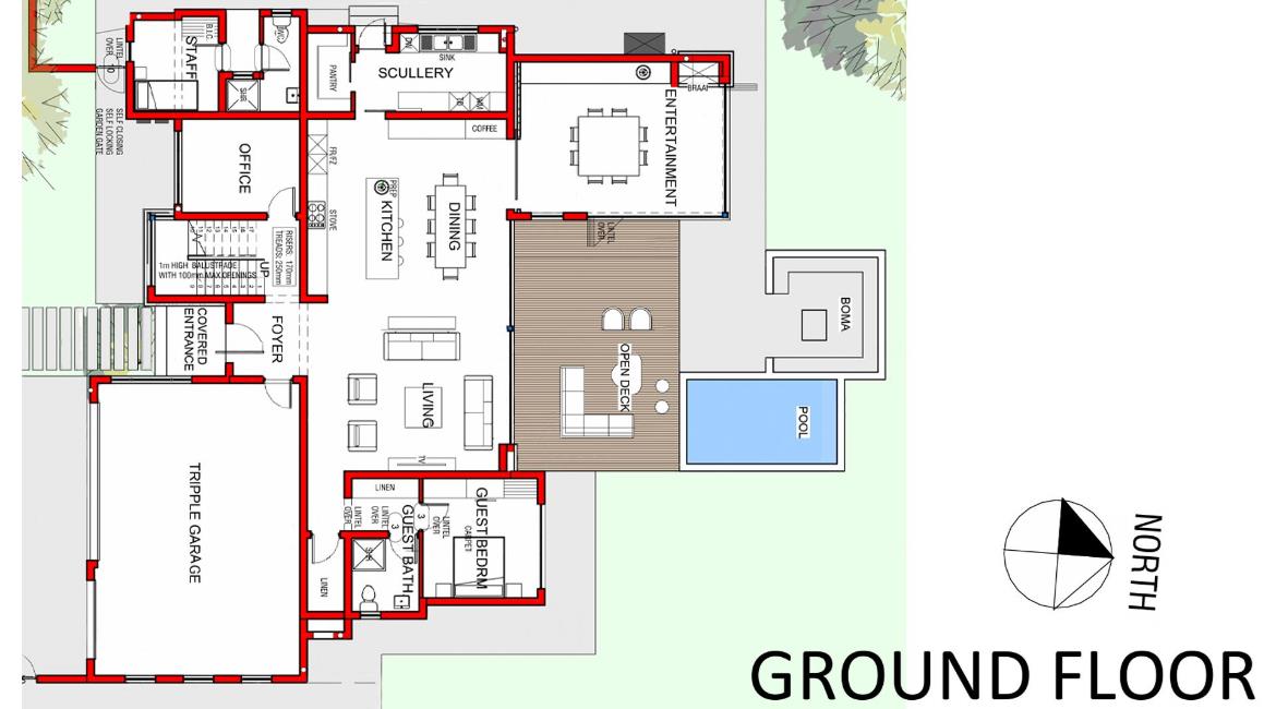 A private office offers the ideal work-from-home space, while the ensuite guest bedroom provides comfort and privacy for visitors. A triple garage and full staff quarters complete the ground level's practical layout.