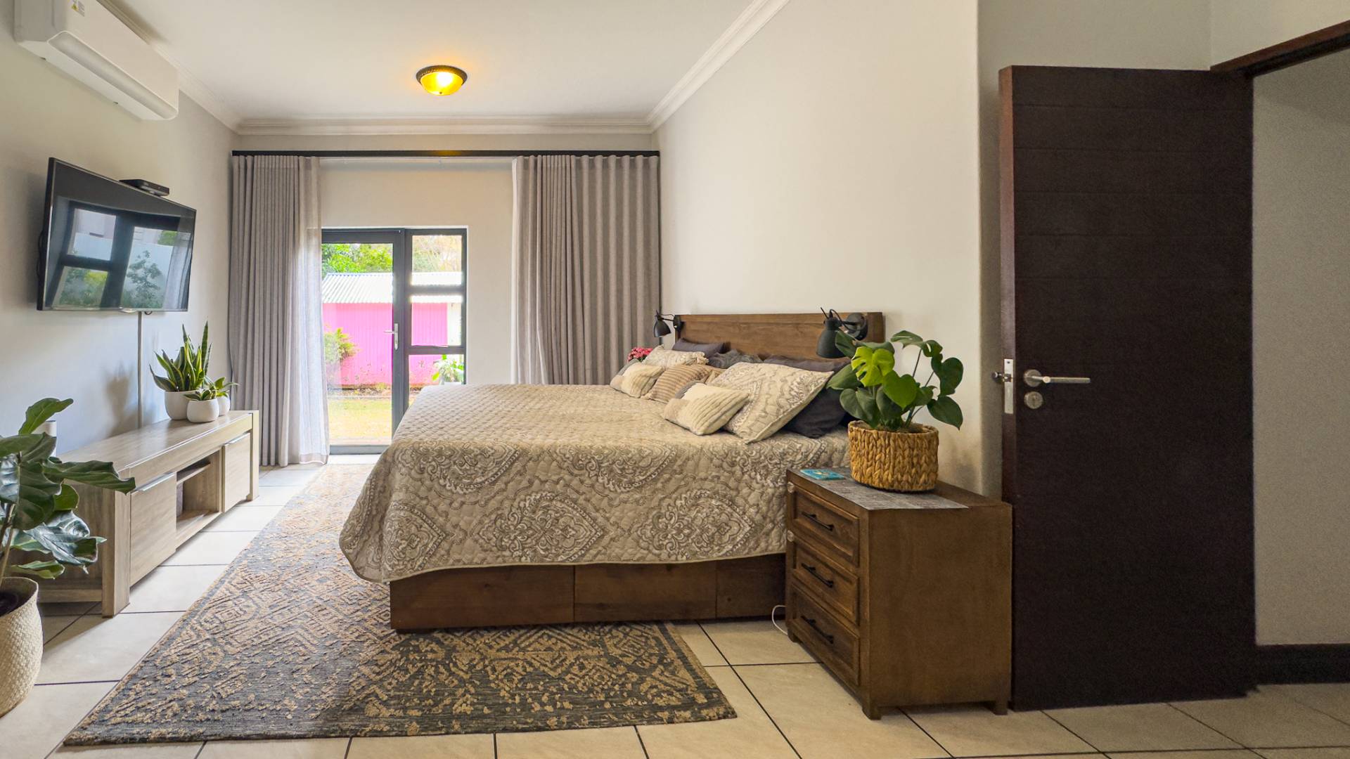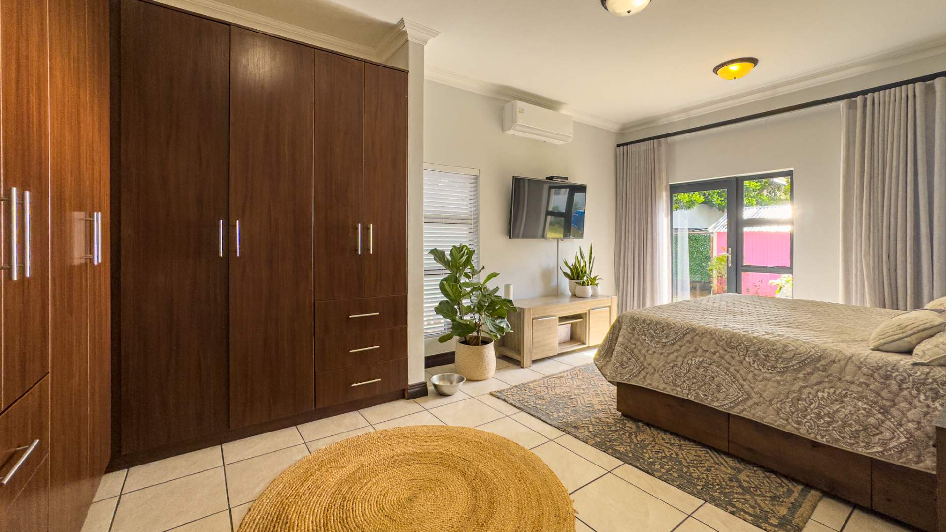 The heart of this home is its main living area & dining room, featuring a cozy gas fireplace that invites warmth and ambiance. Experience the seamless integration of indoor and outdoor spaces with folding stacking doors that open onto a beautifully designed undercover patio, complete with a built-in braai. This space is perfect for entertaining guests or enjoying tranquil family evenings. The expansive garden is a paradise for children and pets to explore and play.