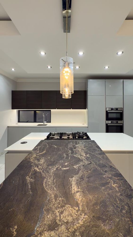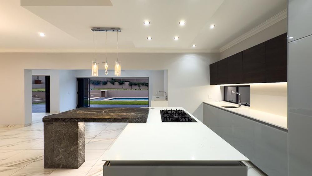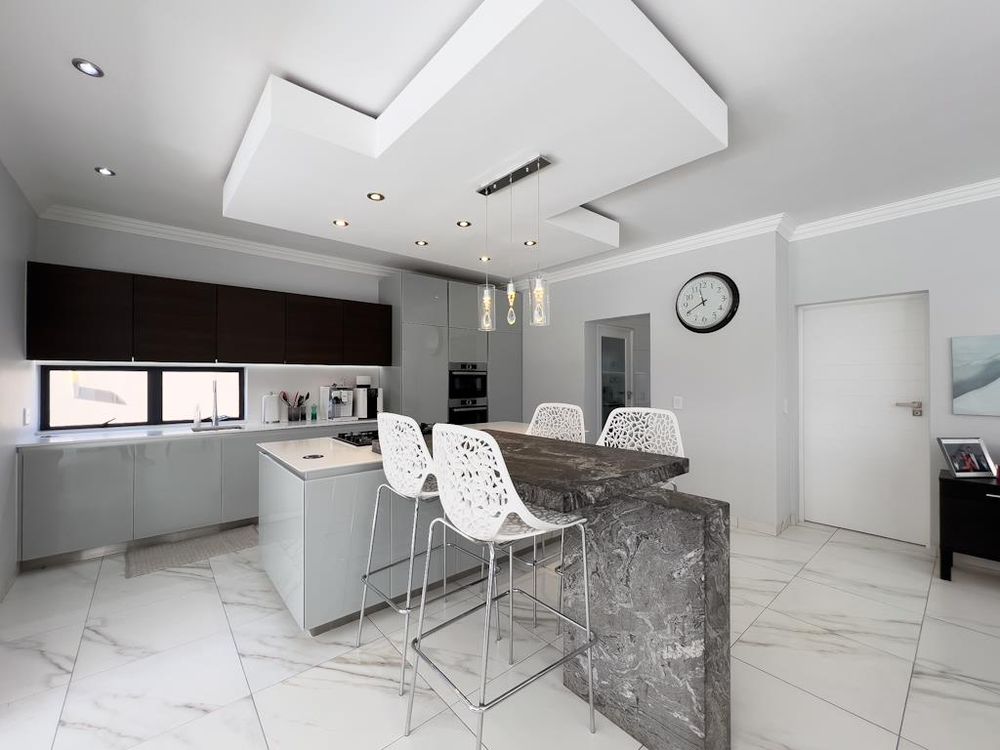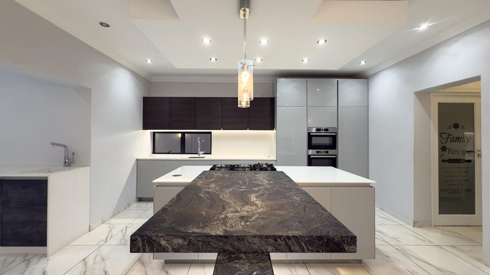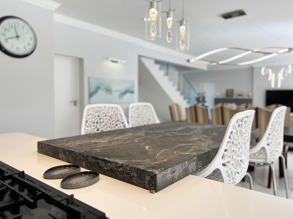 Blueline-designed kitchen with raw granite island, walk-in pantry & large scullery