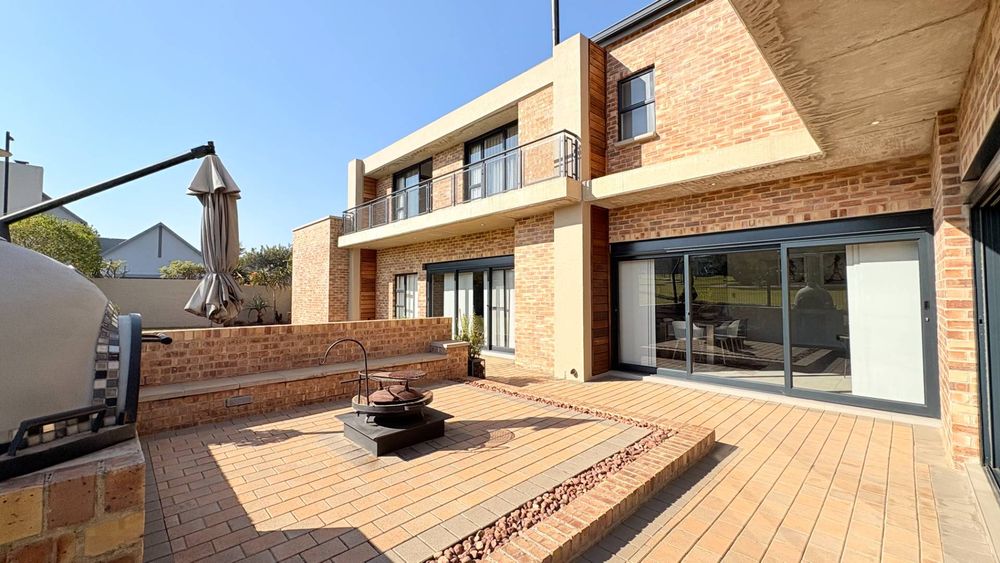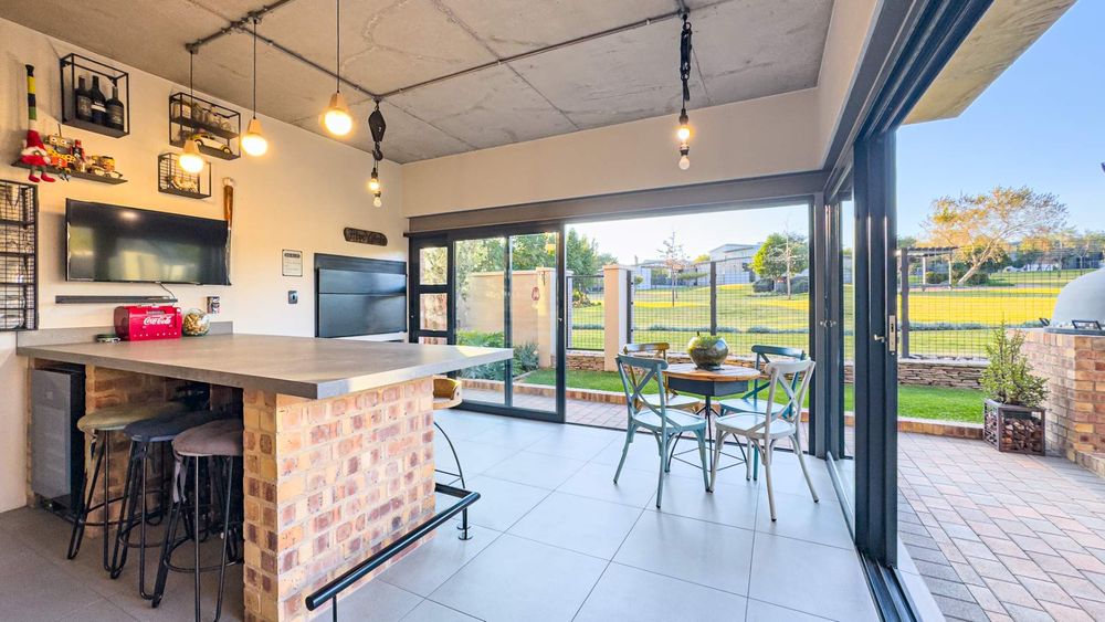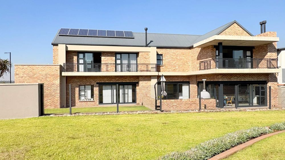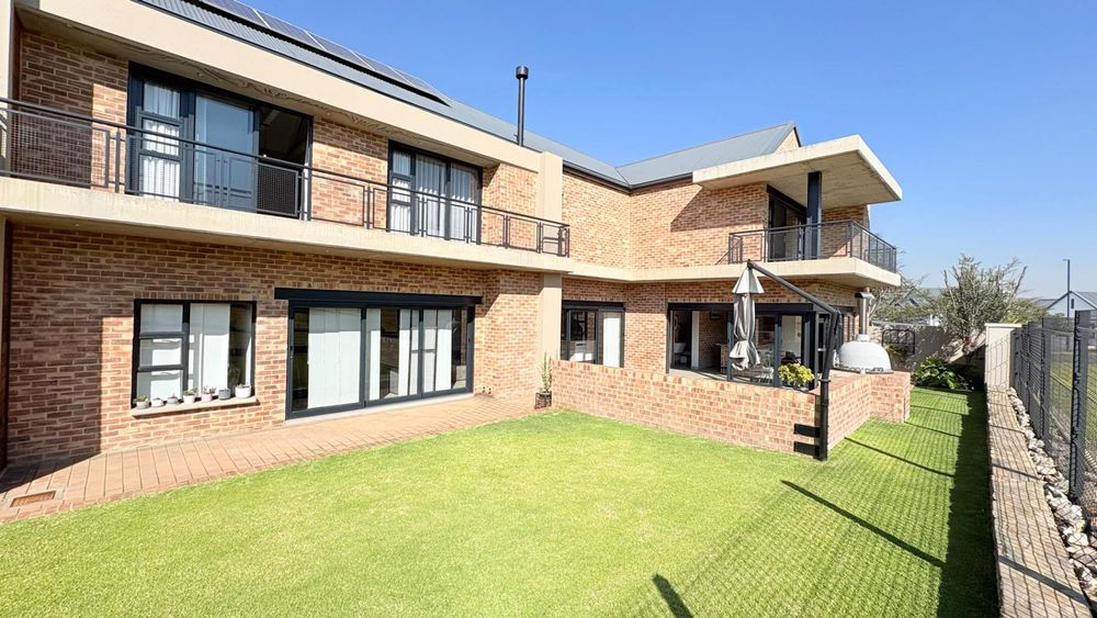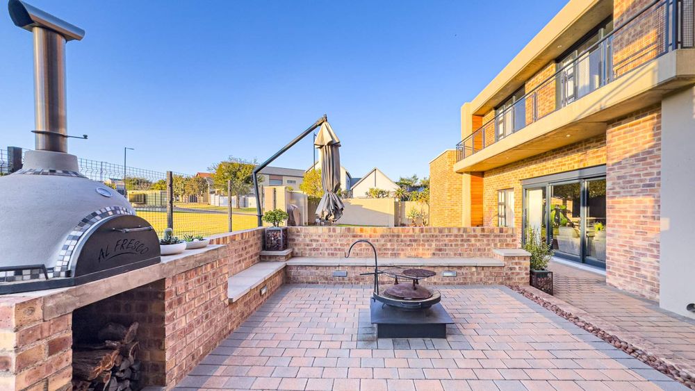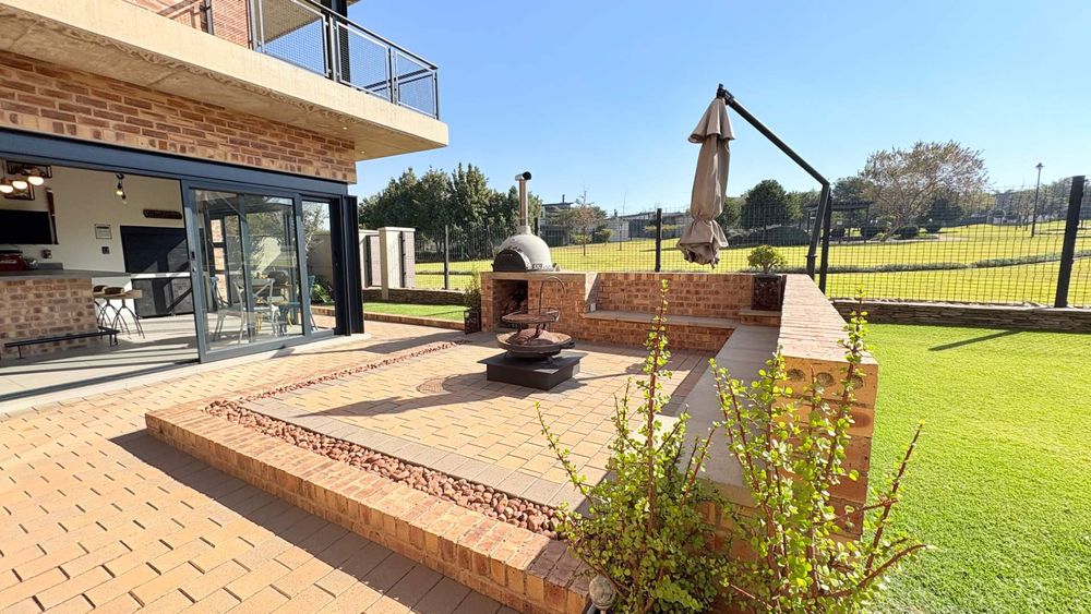 This well designed open plan home offers you 4 Bedrooms all en suite, 3 Garages, 3 Open plan design living areas seamlessly living on the outdoor Boma area overlooking the park. You have the luxury of an indoor and outdoor braai area with pizza oven for that little extra entertainment catering. You have a separate north facing study & a private staff room with courtyard.