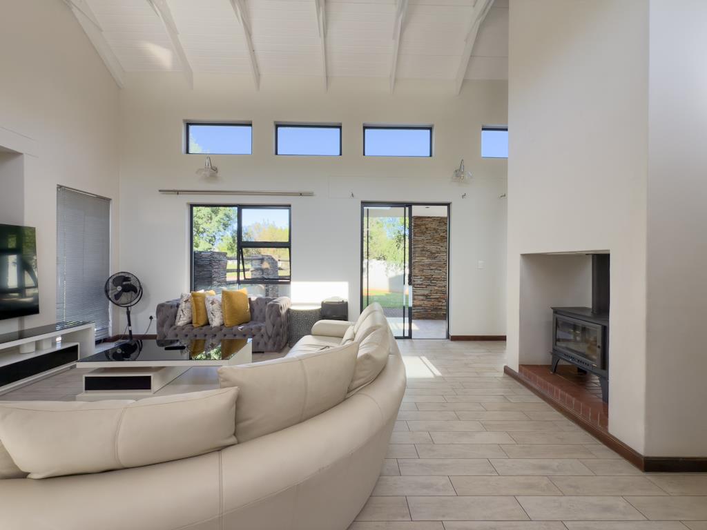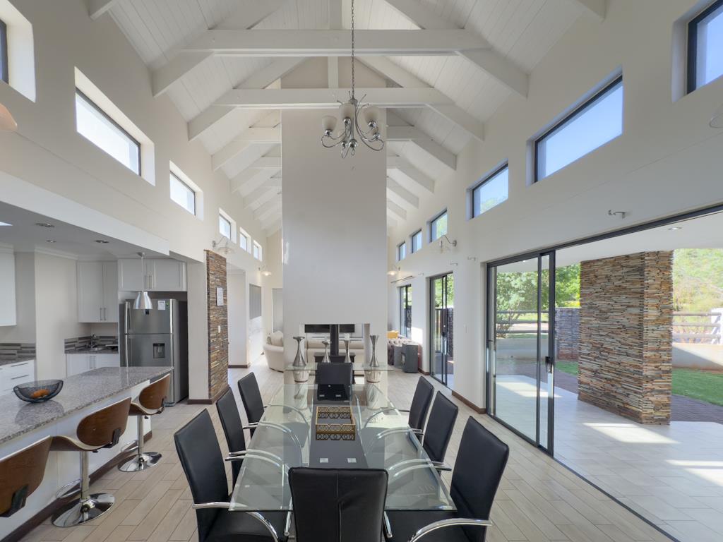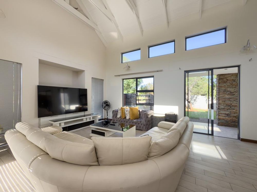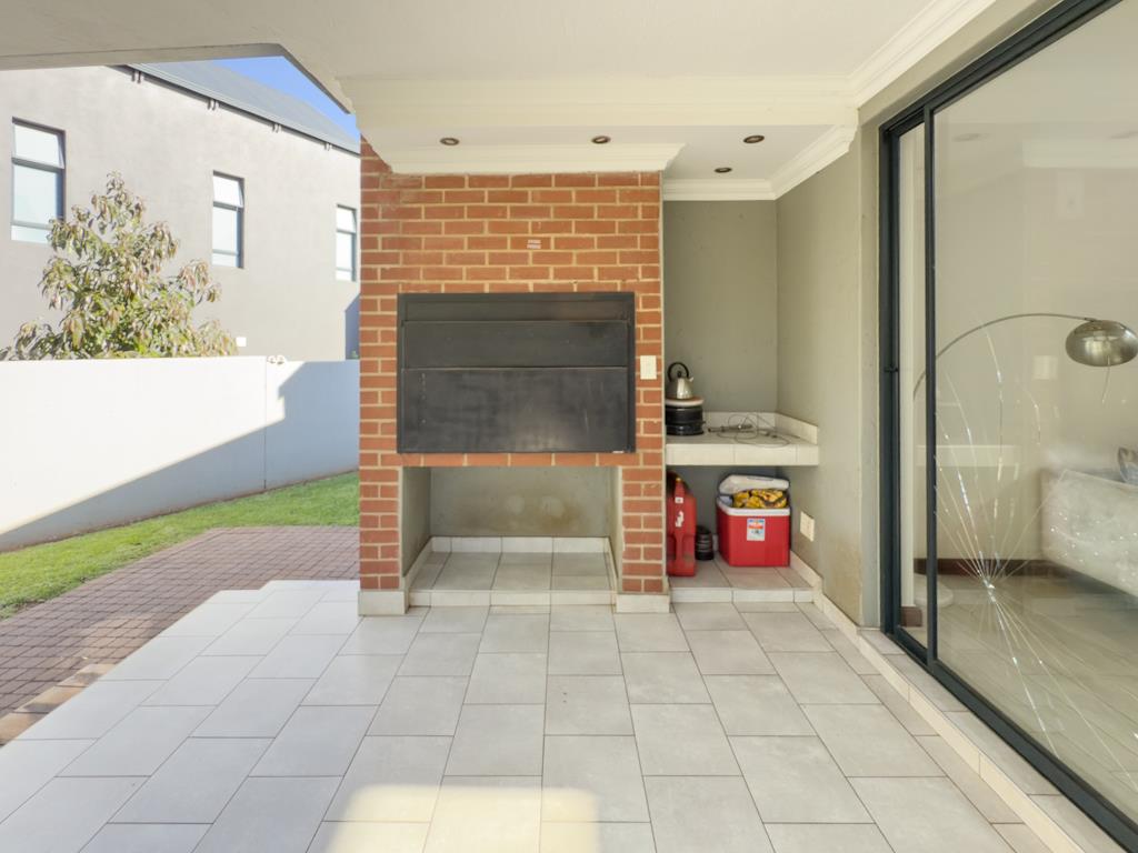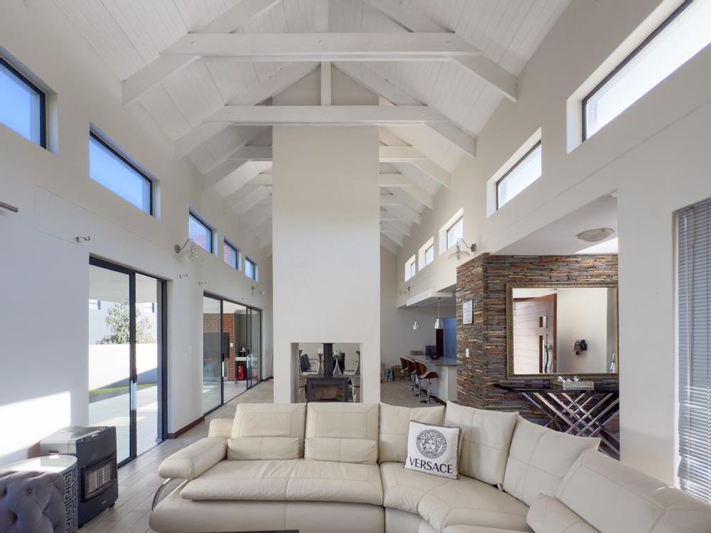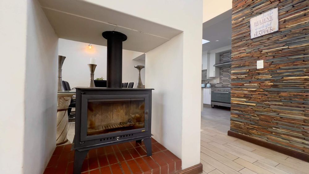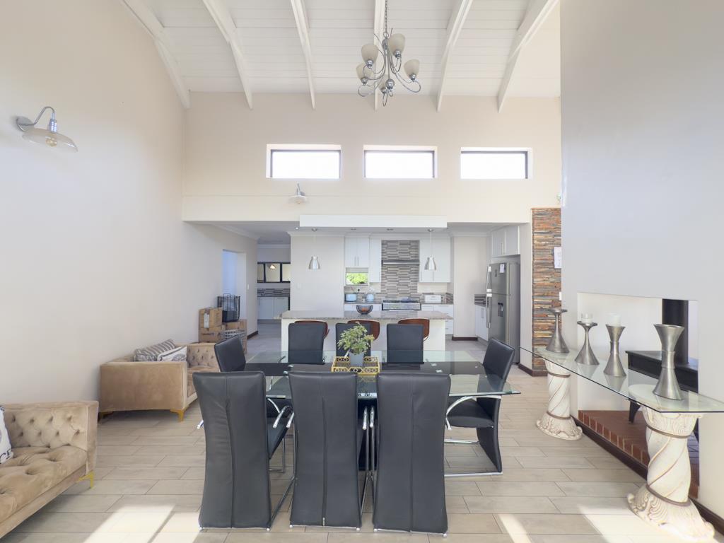 A welcoming entrance hall leads into a spacious, open-plan living area that integrates the lounge, dining room, and kitchen seamlessly. The covered patio with a built-in braai extends from the living area, creating a smooth indoor-outdoor flow — ideal for year-round entertaining.