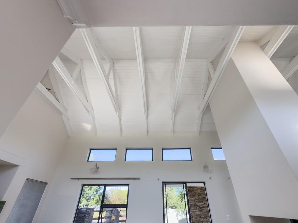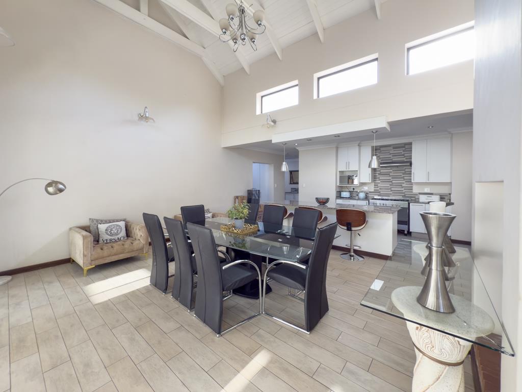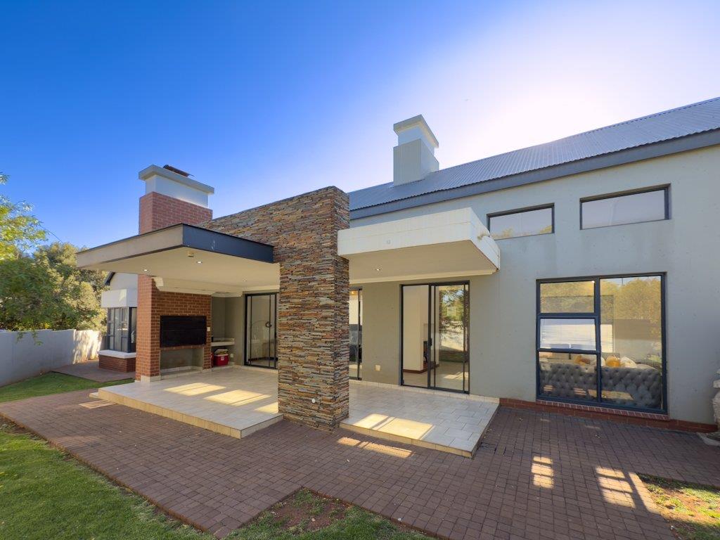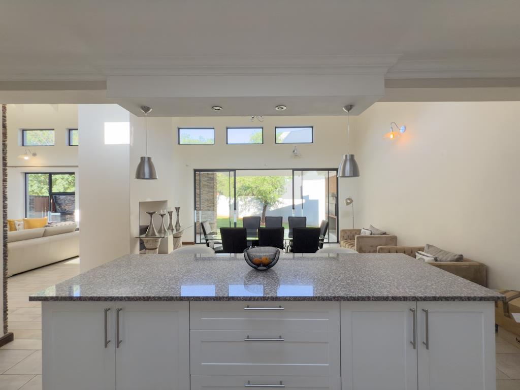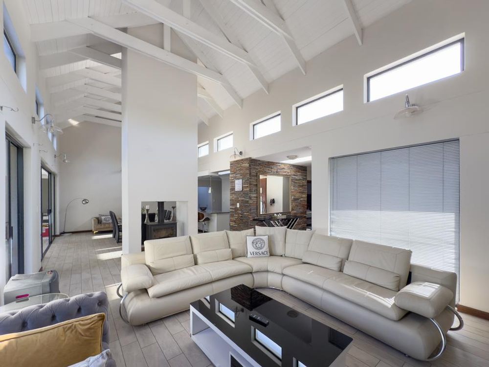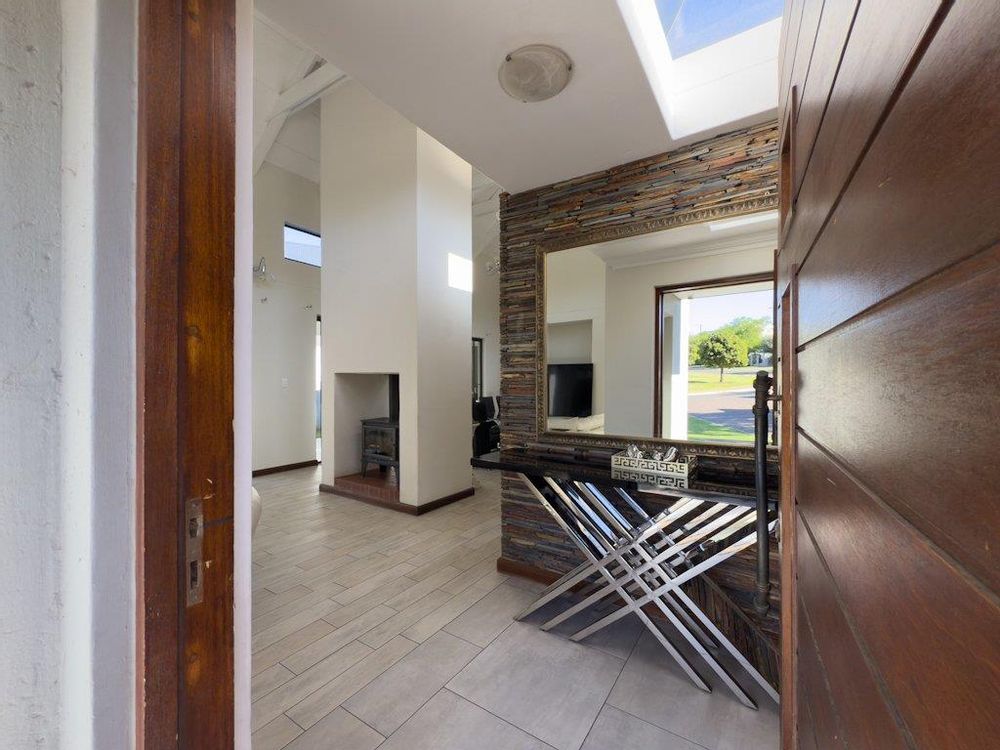 A welcoming entrance hall leads into a spacious, open-plan living area that integrates the lounge, dining room, and kitchen seamlessly. The covered patio with a built-in braai extends from the living area, creating a smooth indoor-outdoor flow — ideal for year-round entertaining.
