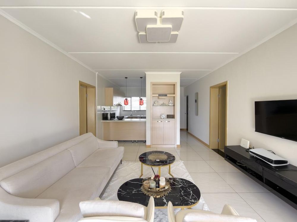 The modern kitchen features elegant Caesarstone countertops, porcelain tiles, and space for under-counter appliances, offering both style and functionality.