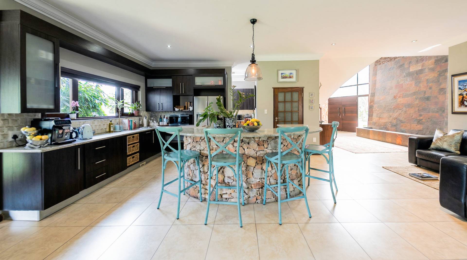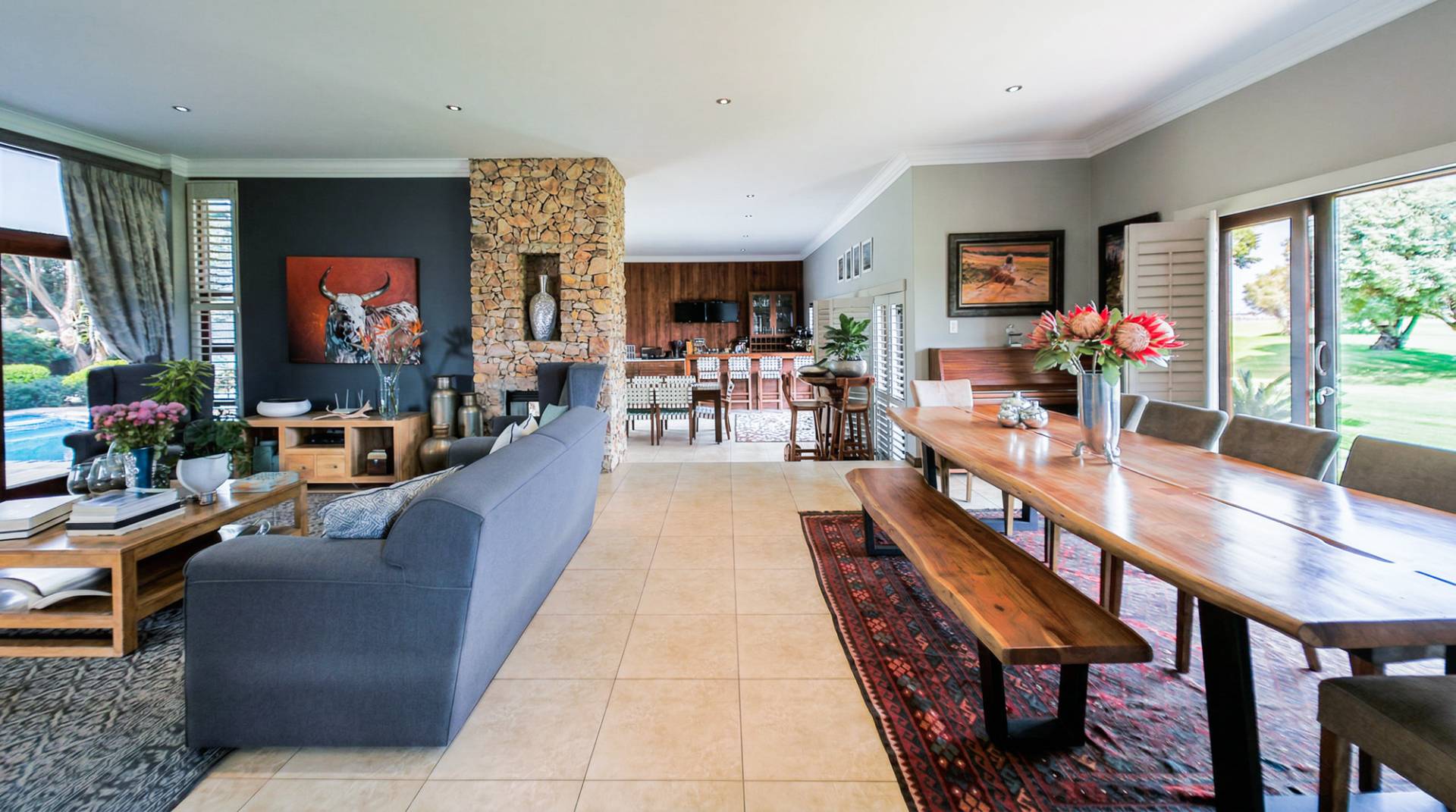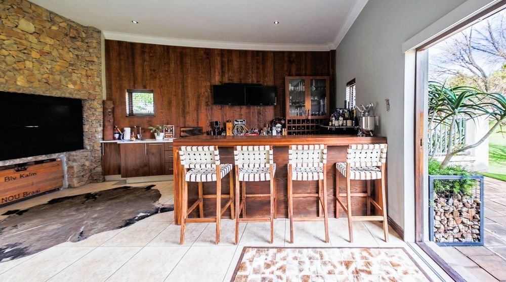 As you step into this magnificent residence, you will be greeted by double volume open plan living areas that exude sophistication and space. The main indoor patio, fitted with shutter blinds, seamlessly integrates with the outdoors, inviting you to enjoy both indoor and outdoor braai experiences. Every corner of this home is thoughtfully designed to maximize the lush green vistas that surround it.