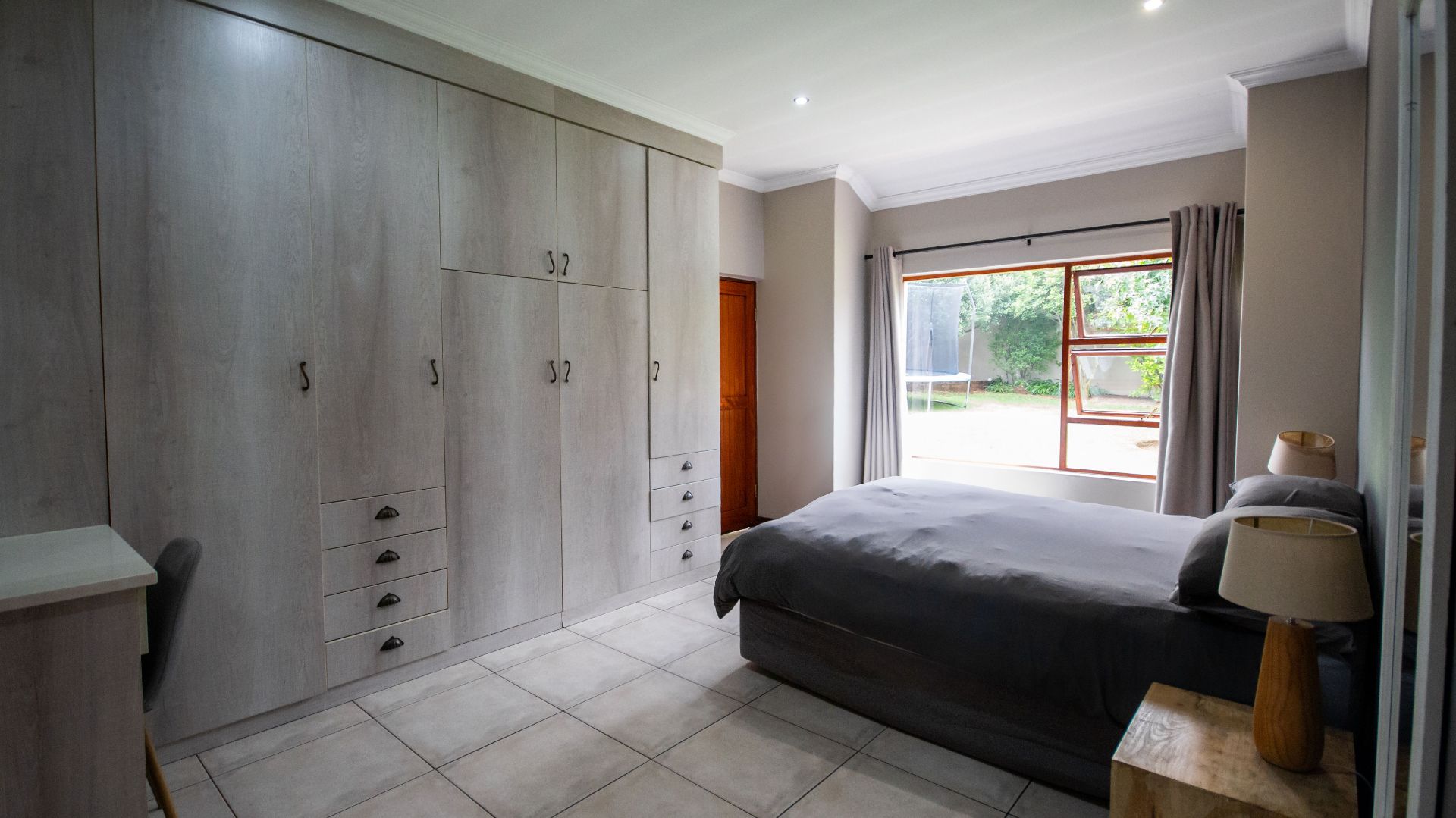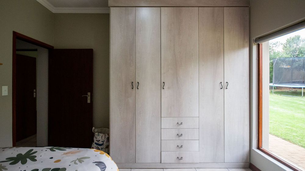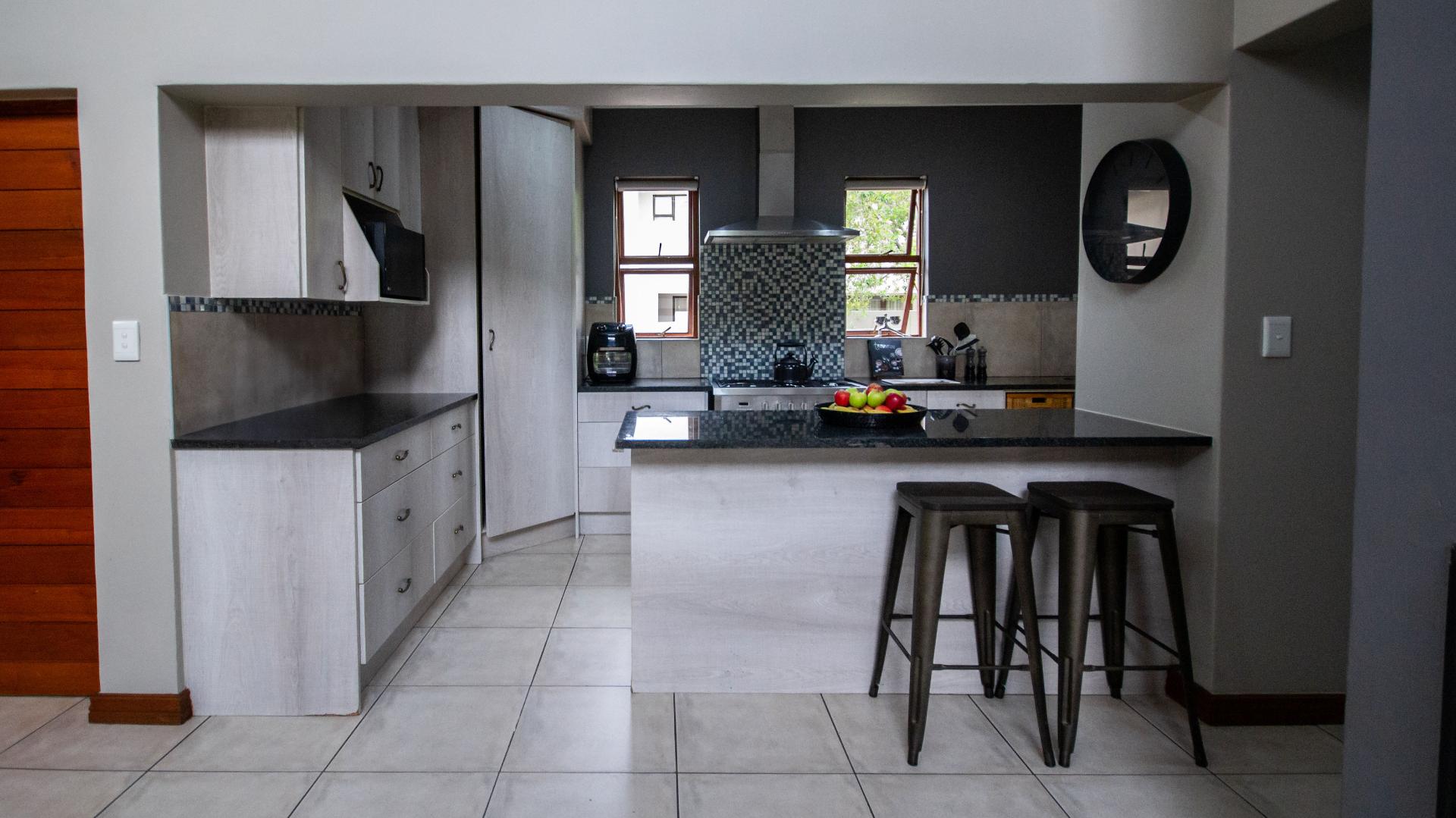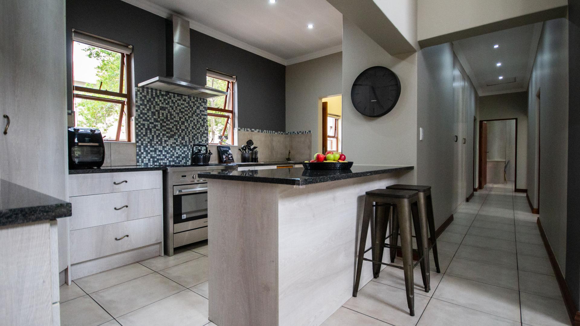 The open plan lounge & dining room offers a wood burn fireplace to secure a cozy winter atmosphere and climate control. The exposed beams and open design allows in so much light making this my favourite part of the home. The kitchen is centrally located for hours of entertainment and being together around food. Kitchen fitted with gas stove & Electric oven. Separate scullery, walk in pantry and space for all electrical appliances.
