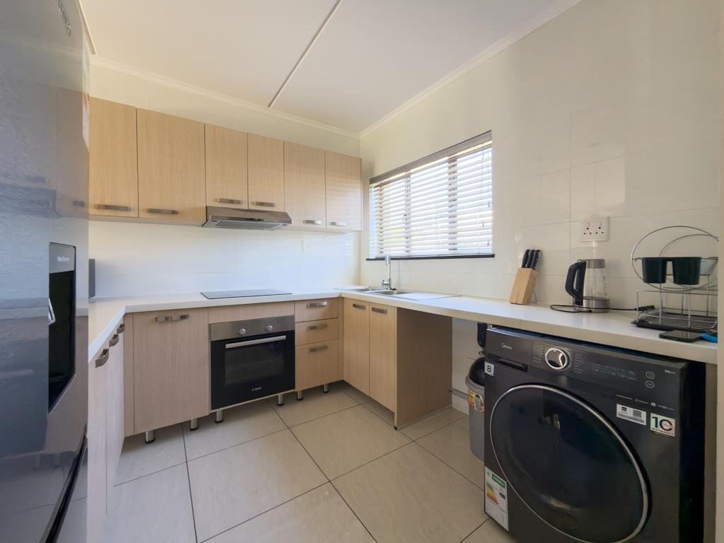 The modern kitchen features elegant Caesarstone countertops, porcelain tiles, and space for under-counter appliances, offering both style and functionality.