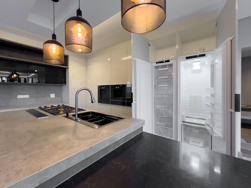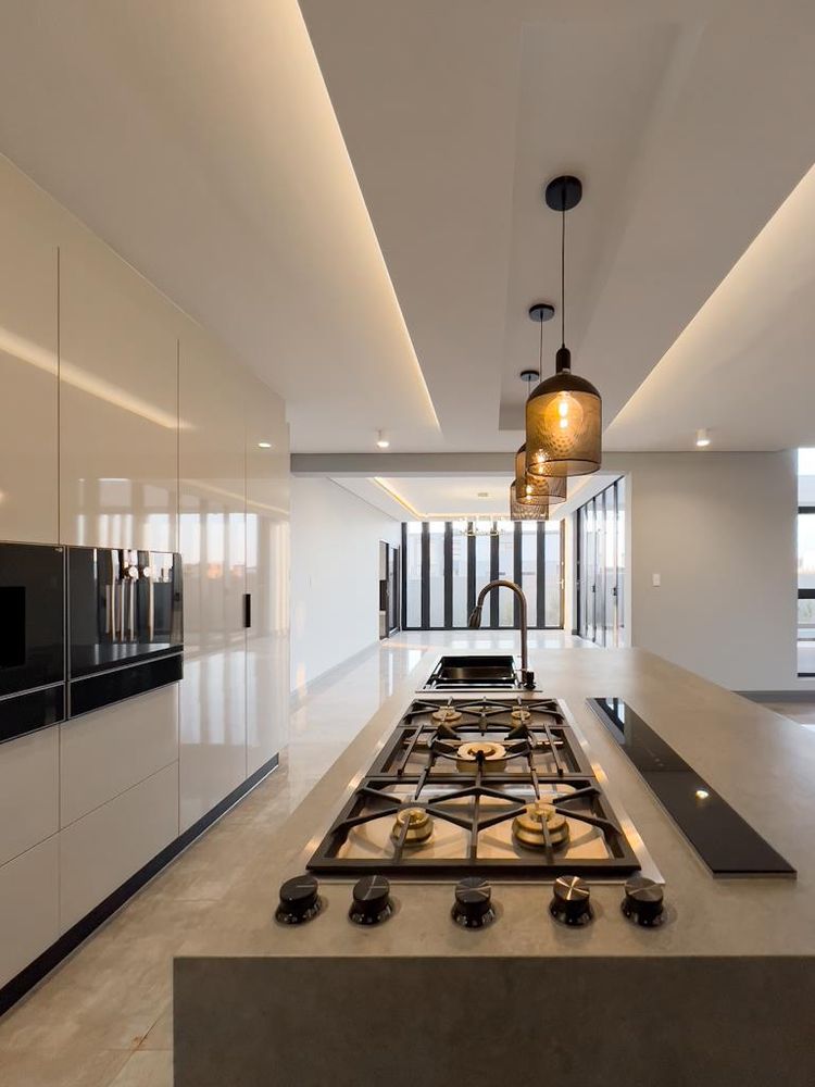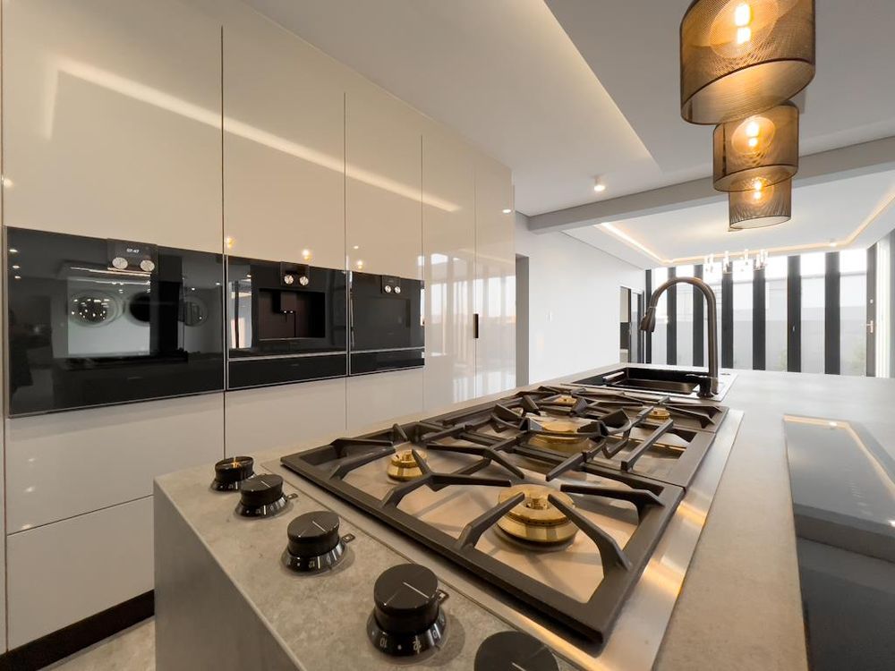 Chef's kitchen with Gaggenau appliances, Sino countertops, double fridge, and dual touch-top stoves
