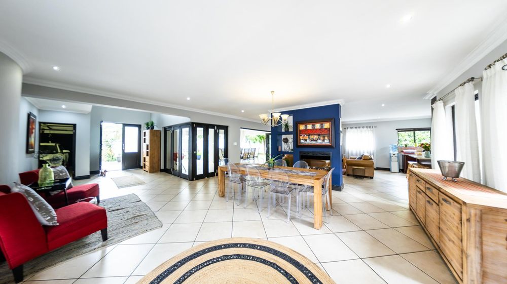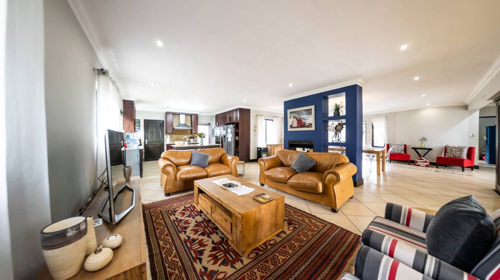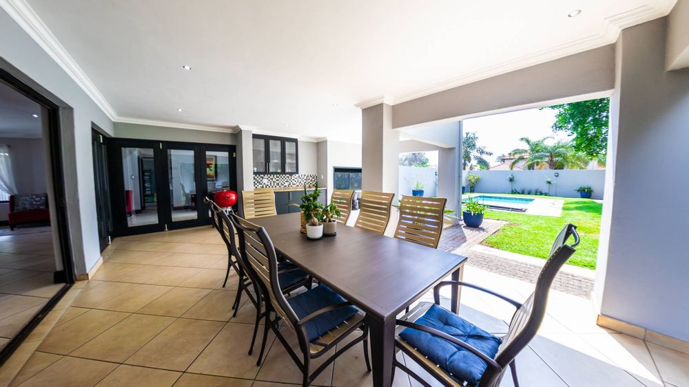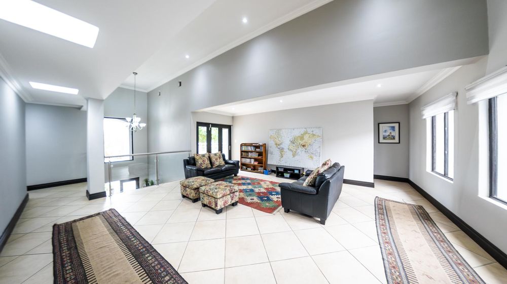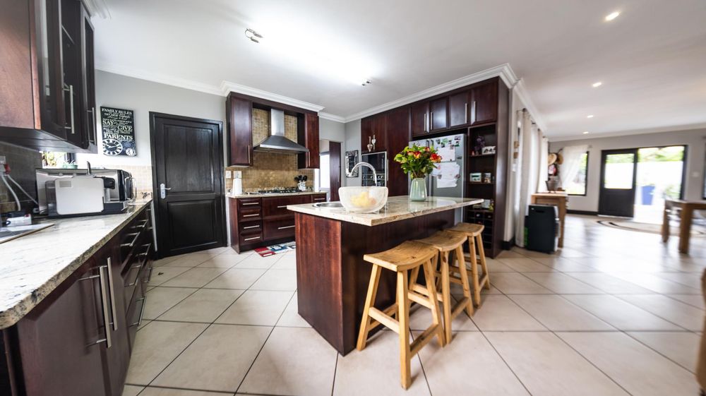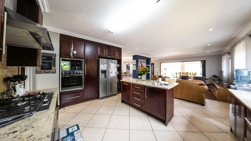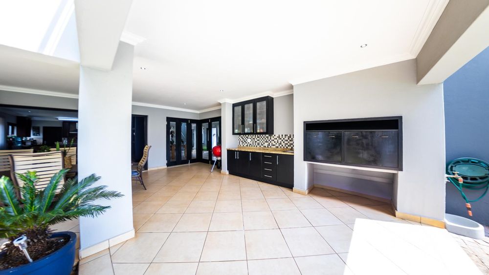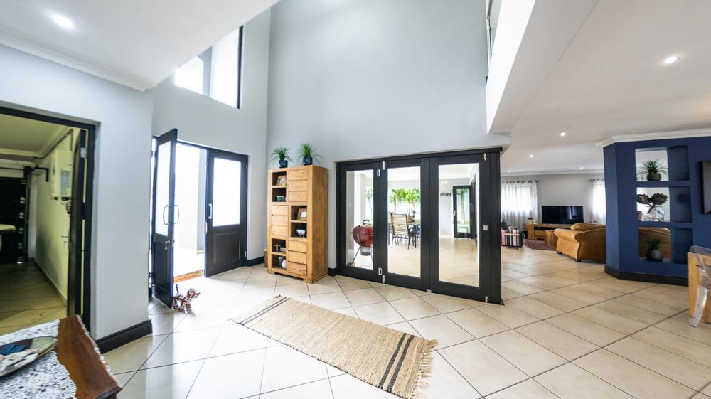 Welcoming foyer and entrance leads you into the large open plan downstairs living area. The property has been designed to offer entertainment on a large scale. For that seamless floorspace integration, Lounge & Dining room are connected by a feature wall with a fireplace . The folding stacking doors open completely inviting the outdoor space indoors and vice versa. In the kitchen you will be spoilt with ample cupboard & counterspace...even a walk in pantry and separate scullery - what is more you have a separate laundry room with enough space for additional laundry features such as ironing.