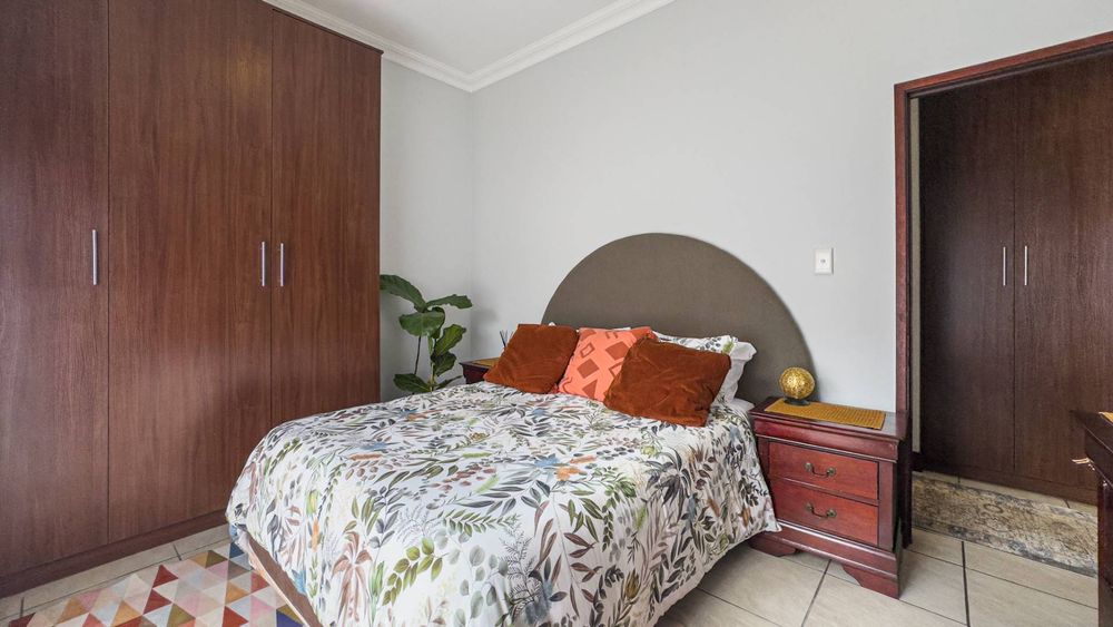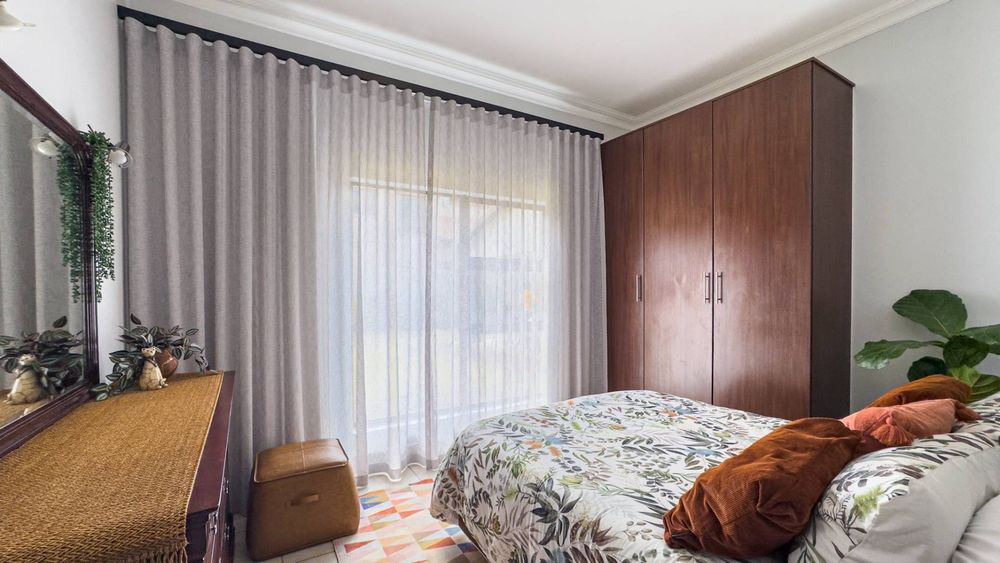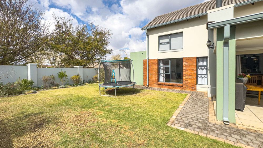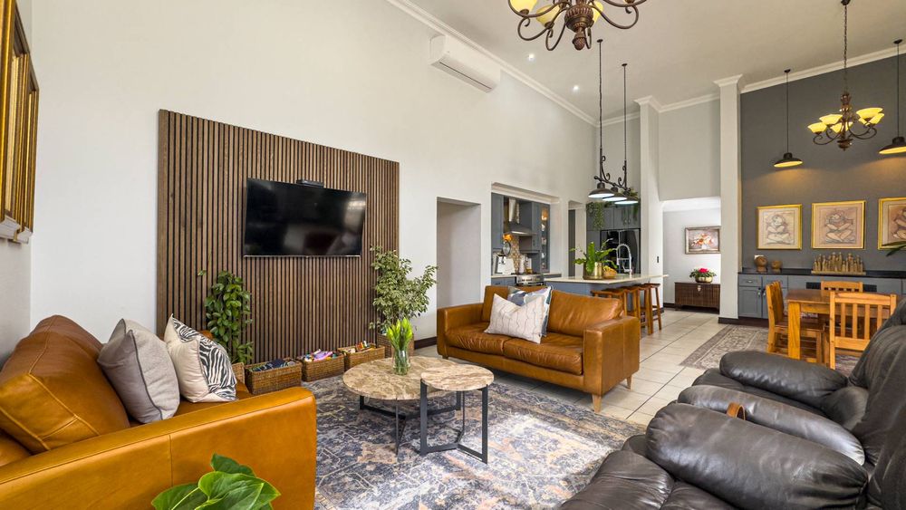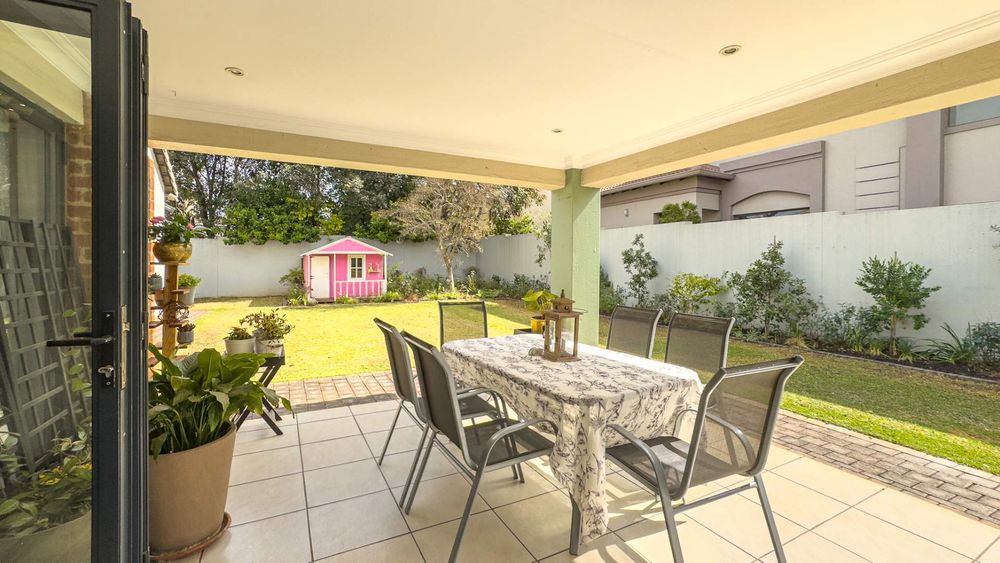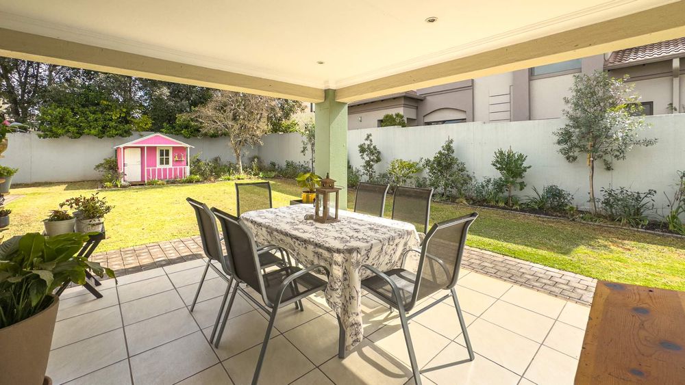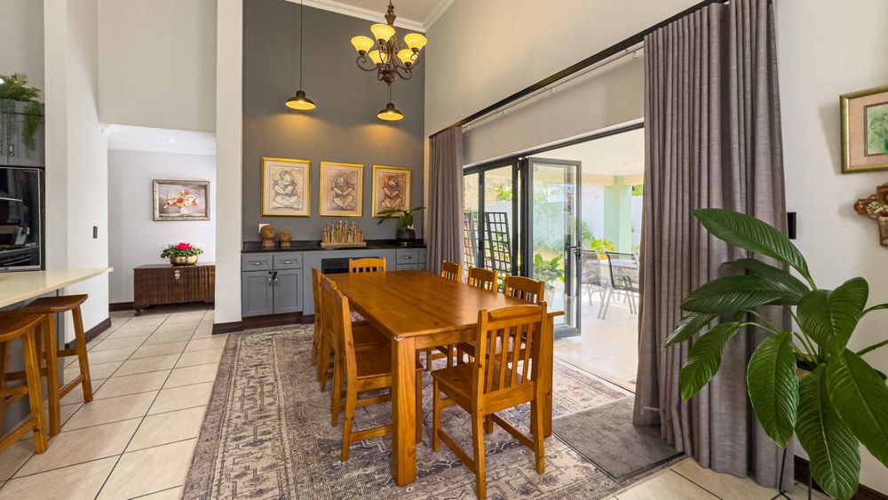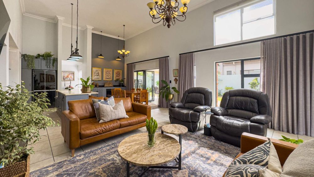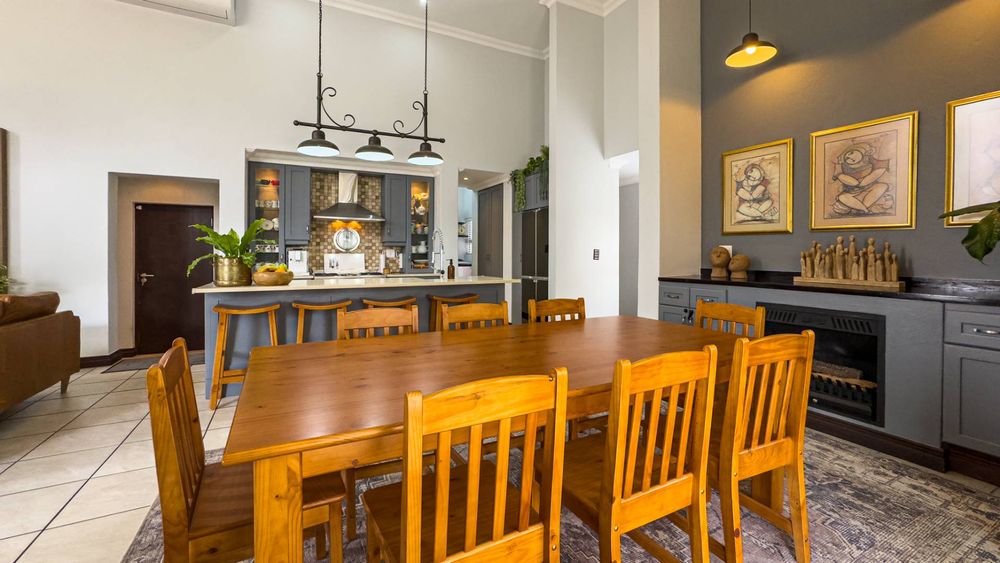 The heart of this home is its main living area & dining room, featuring a cozy gas fireplace that invites warmth and ambiance. Experience the seamless integration of indoor and outdoor spaces with folding stacking doors that open onto a beautifully designed undercover patio, complete with a built-in braai. This space is perfect for entertaining guests or enjoying tranquil family evenings. The expansive garden is a paradise for children and pets to explore and play.