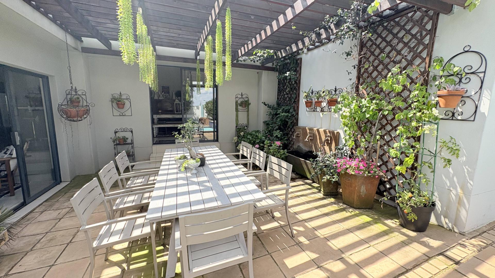 Outdoor meets indoor with Aluminium sliding doors that open onto a beautiful pergola overlooking the sparkling pool.